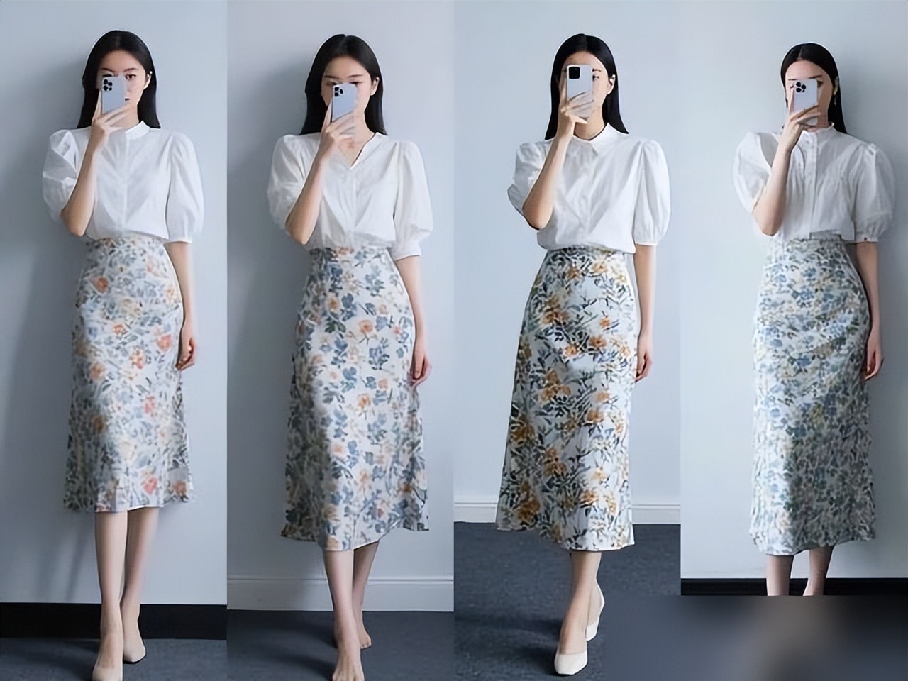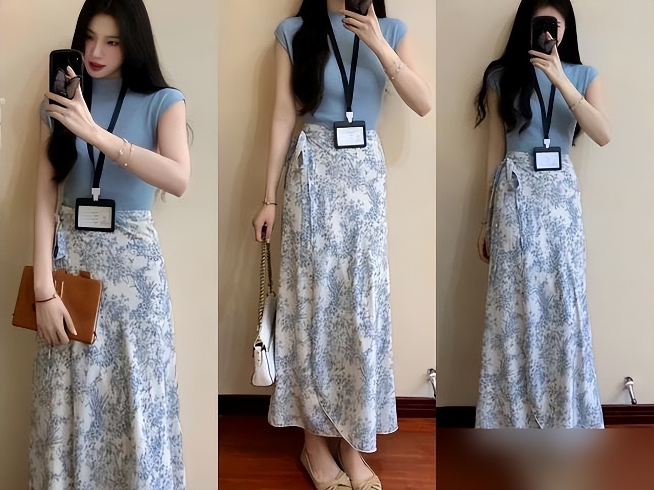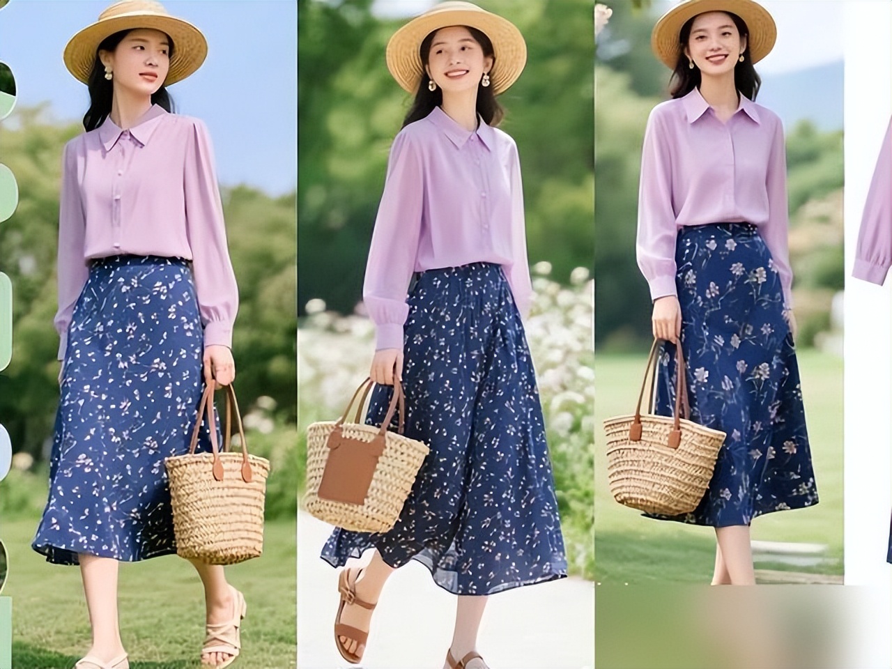 霧霾紫上衣+灰綠鳶尾半裙,"莫蘭迪配色"自帶柔光濾鏡;梨形身材把衣角全塞進去,A字裙擺一甩一甩,大腿的肉瞬間隱形。