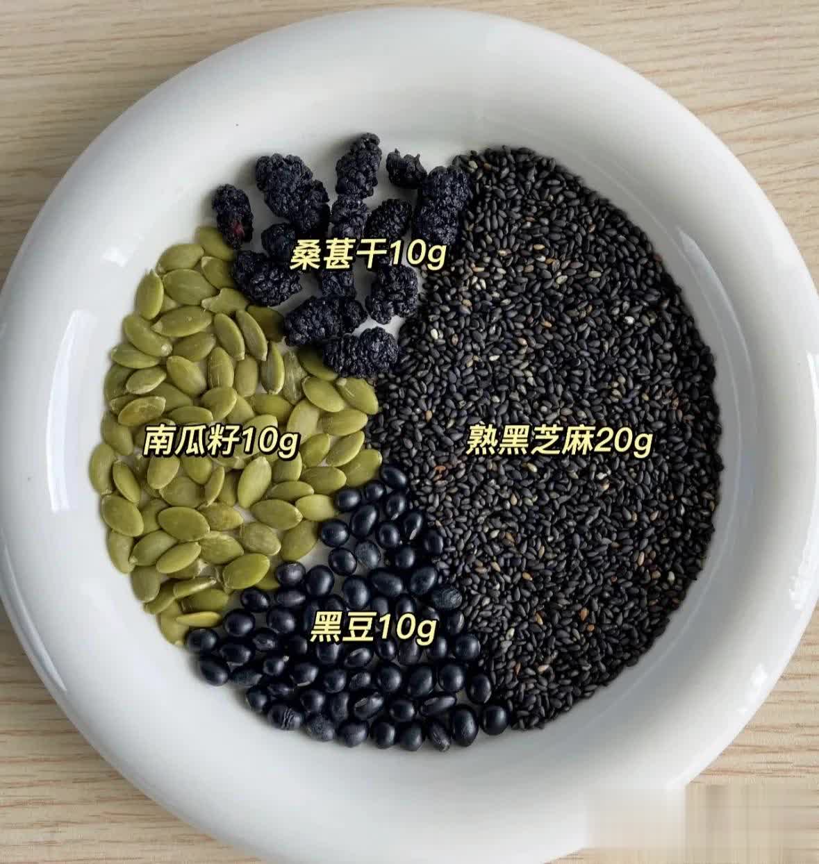 原來里面還有我不知道的奧秘。今天把這個方法也分享給大家。我們今天里面所用到的食材非常的簡單,就是家里面所要用到的黑豆、黑芝麻還有桑葚干。除此之外,還有一味非常重要的食材就是南瓜籽。