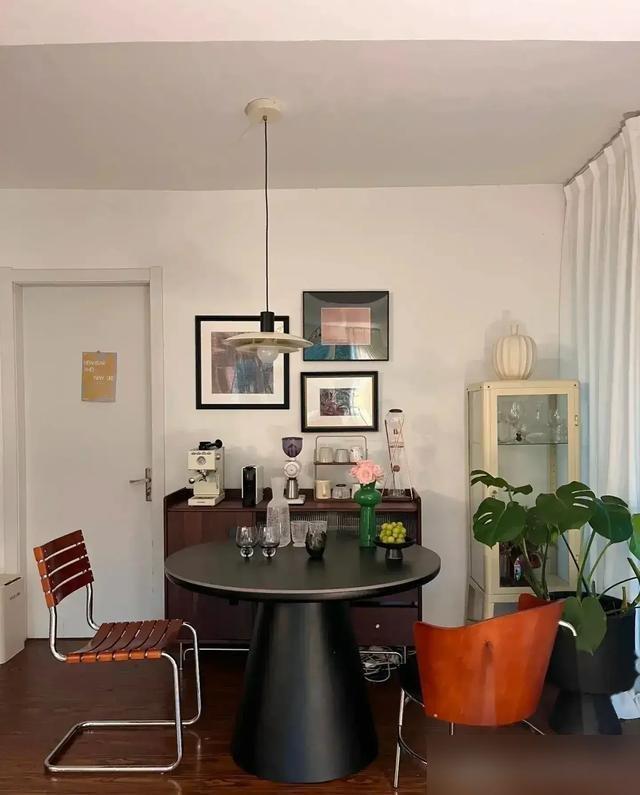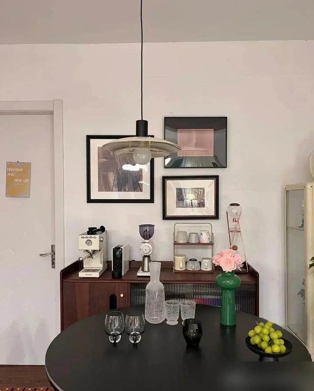 還有餐廳那套搭配,我看了都想坐下來吃碗米線:黑色圓餐桌配暖黃藤編燈,餐邊柜上擺著粗陶碗和干蓮蓬,不是什么名貴貨,可湊在一起就有“煙火氣”。我表姐家之前裝修,非要買全套“北歐風骨瓷餐具”,說“高級”,結果每次吃飯都得小心翼翼,怕摔碎了,孩子連個蠟筆都不敢往餐桌上放——你說這樣的餐廳,能有“好好吃飯”的欲望嗎?反而粗陶碗就不一樣,裝碗熱粥、擺盤炸洋芋,連外賣盒放上去都不違和,這才是“吃飯的地方”該有的樣子。