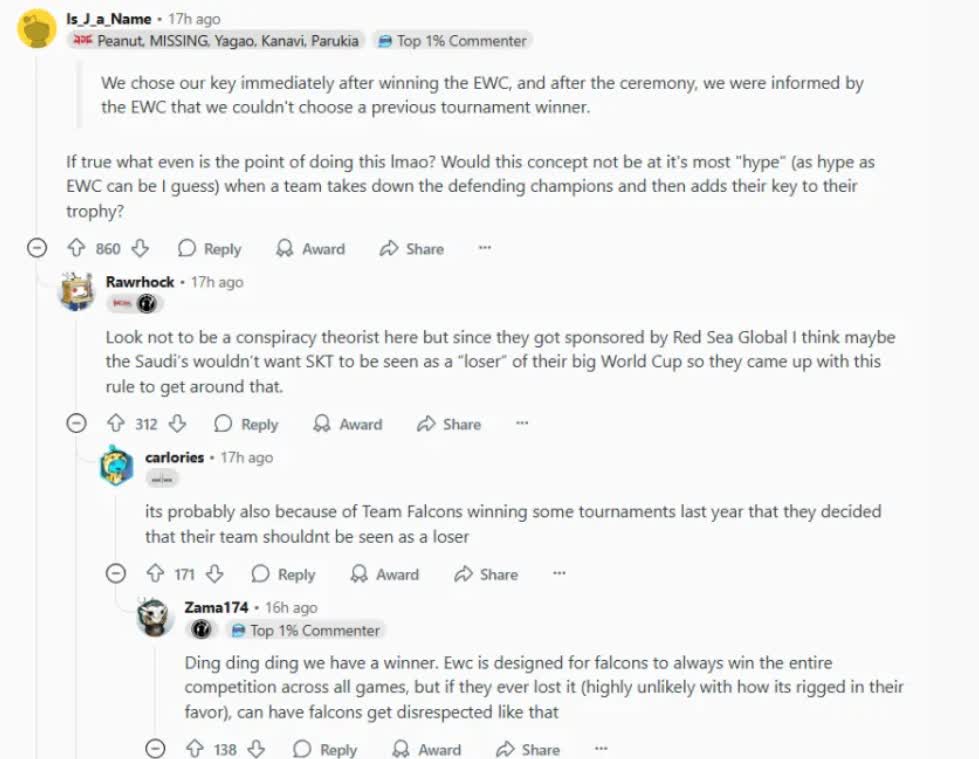 這個事情很快引起軒然大波,官方的解釋是說世界杯的冠軍隊伍不能選擇上一屆的冠軍隊伍來作為自己的獎杯底座,然而這個規則被觀眾們深度懷疑是官方定制的,用來照顧T1戰隊的。