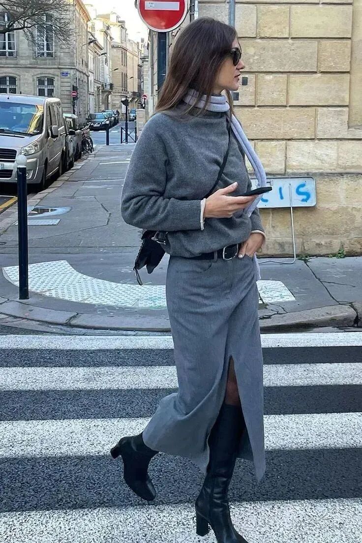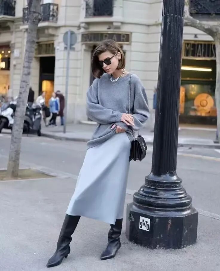 兩種不同色調的灰,組合起來既有層次感又能讓整體造型保持簡潔高級,靴子和包包這些配飾可以選擇黑色作為輔助,與灰色形成對比,顯得更有質感。