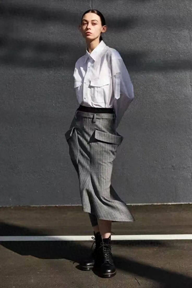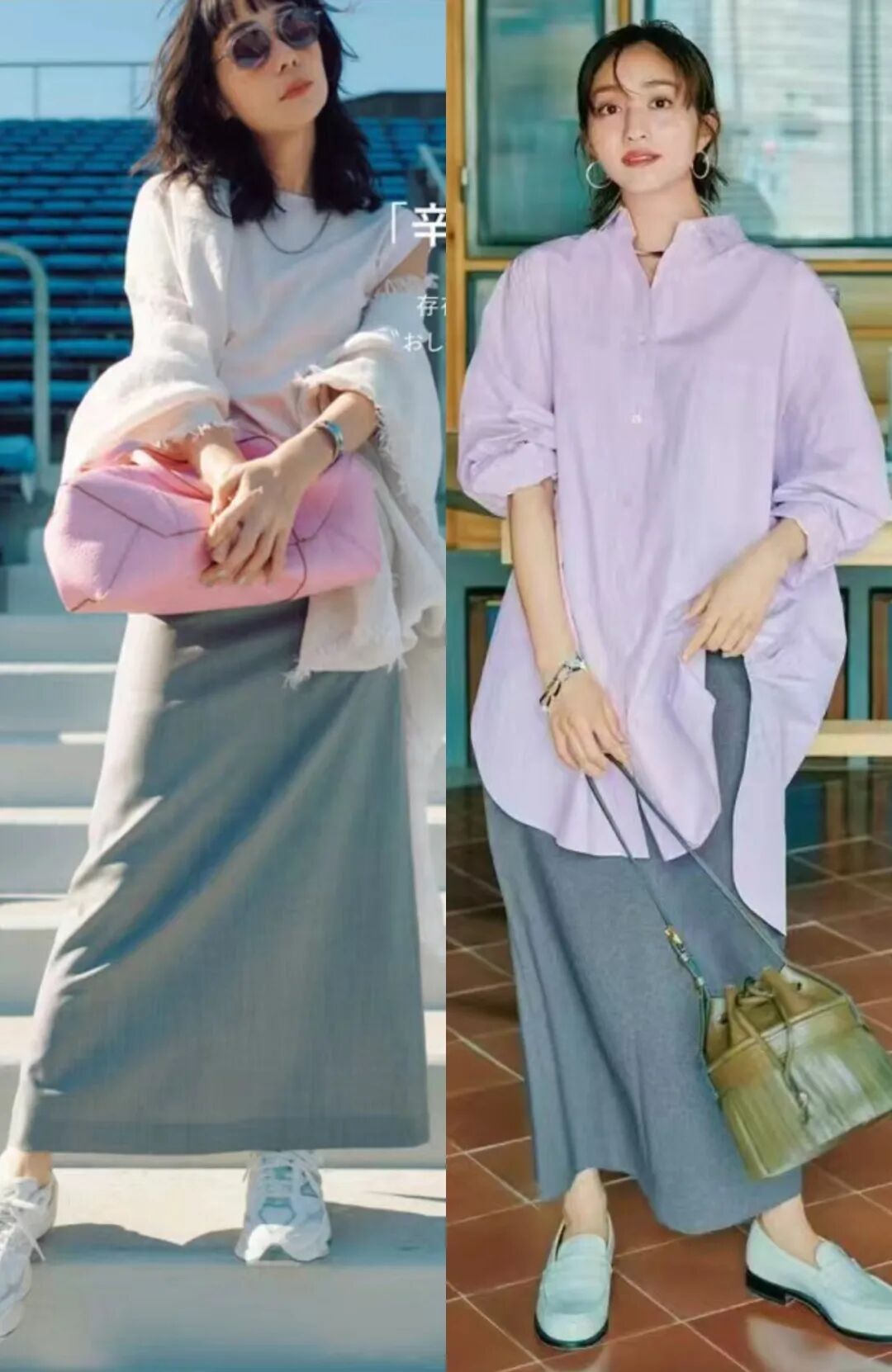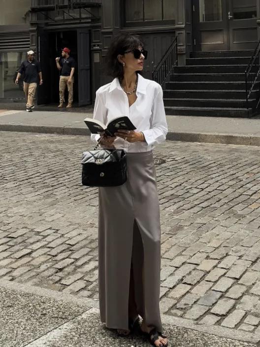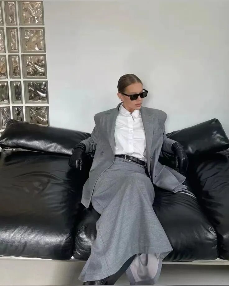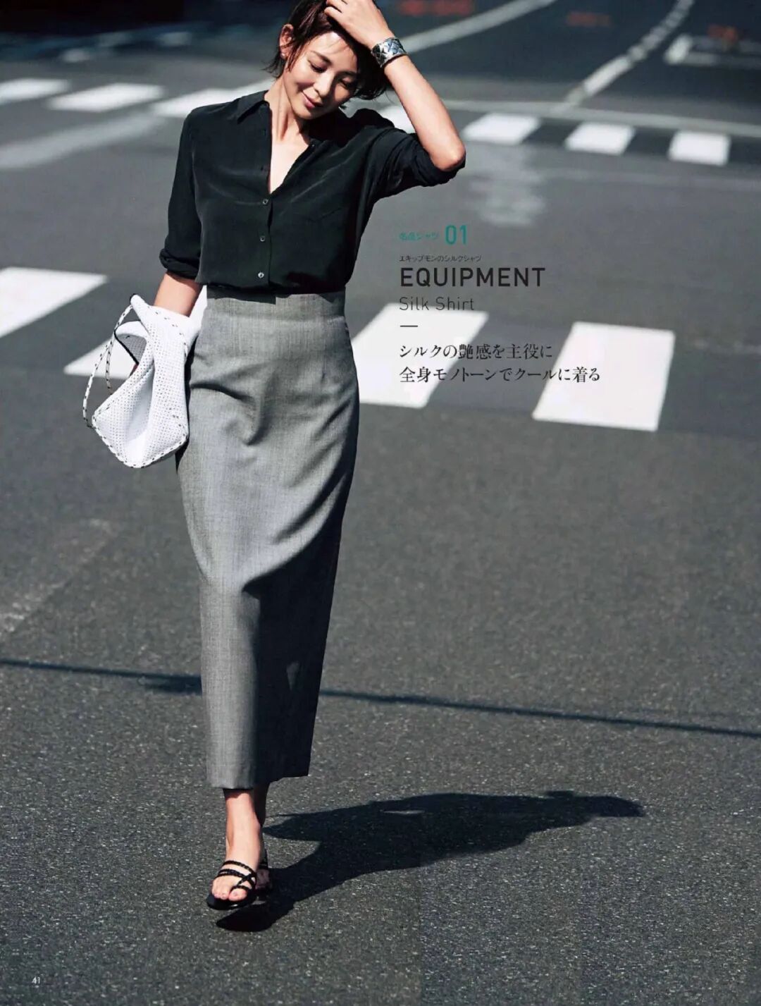 早秋,挑一件黑色襯衫搭配灰色的直筒長裙,沉穩內斂又帶著幾分“知性美”,讓你優雅地收斂鋒芒,但又不失力量感。