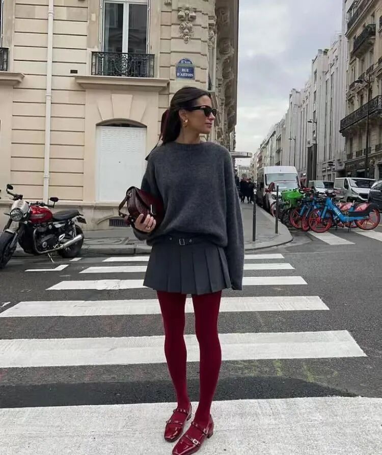 如果怕冷的話還可以穿上酒紅色的長筒襪,再配一雙紅色的“瑪麗珍鞋”,既保暖又能提亮,與一身深灰色的衣裙碰撞出別樣的時髦。