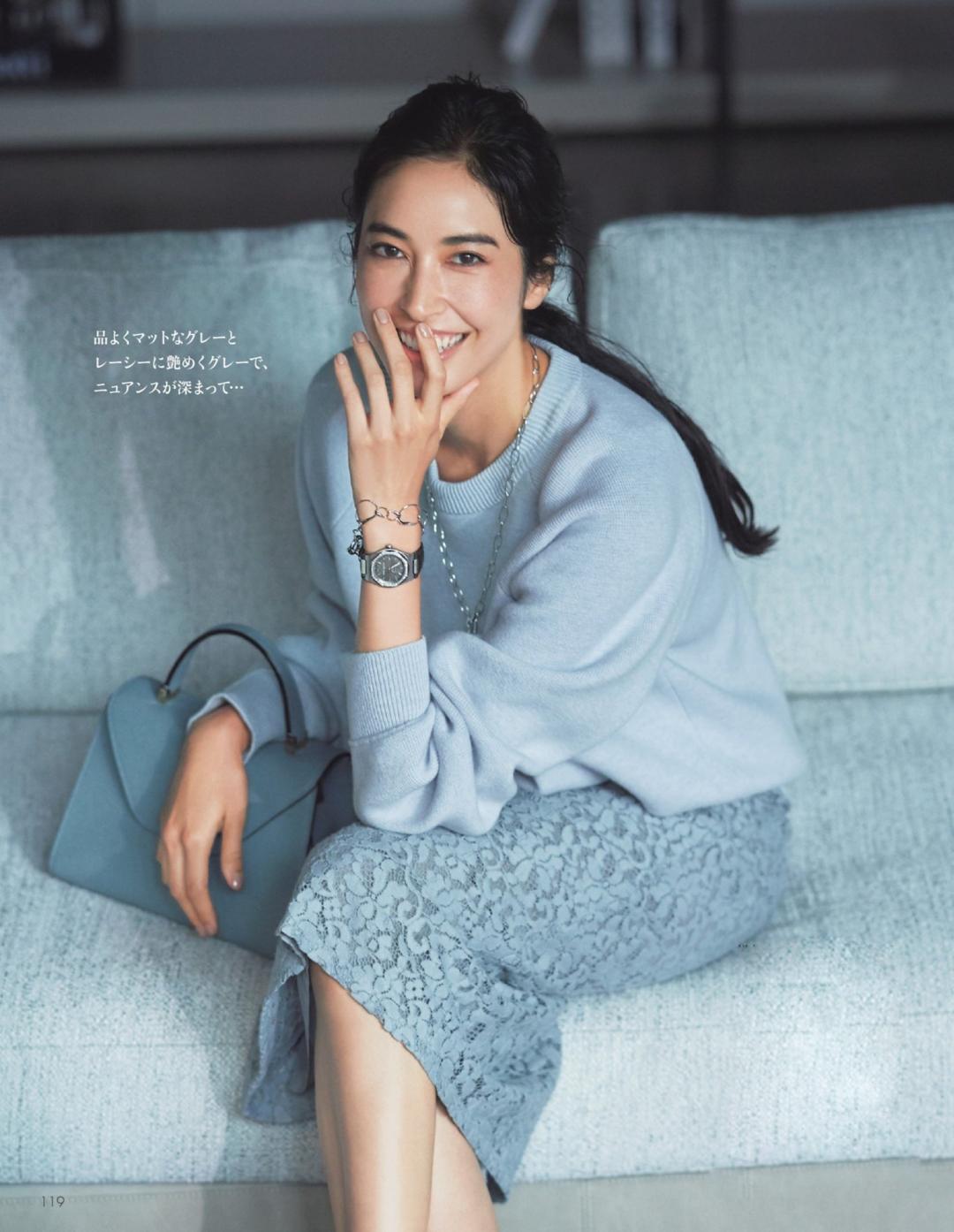 換成灰色的蕾絲直筒裙,多了精致的細節美感,風格也變溫柔不少,搭配灰色毛衣既溫柔又雅致,氣質超美。
