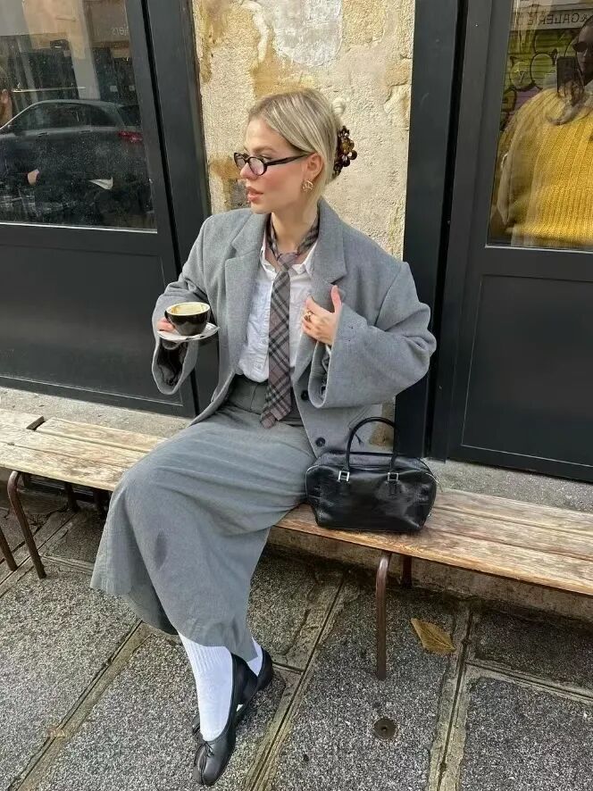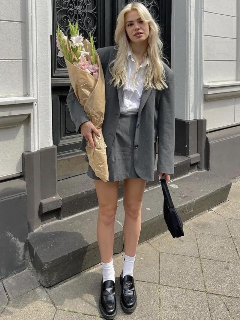 秋冬穿灰色西裝或者大衣的時候,不如將長裙或者褲裝換成一條灰色的小短裙,再配上黑色樂福鞋和襪子,就能穿出優雅時髦又減齡的效果。