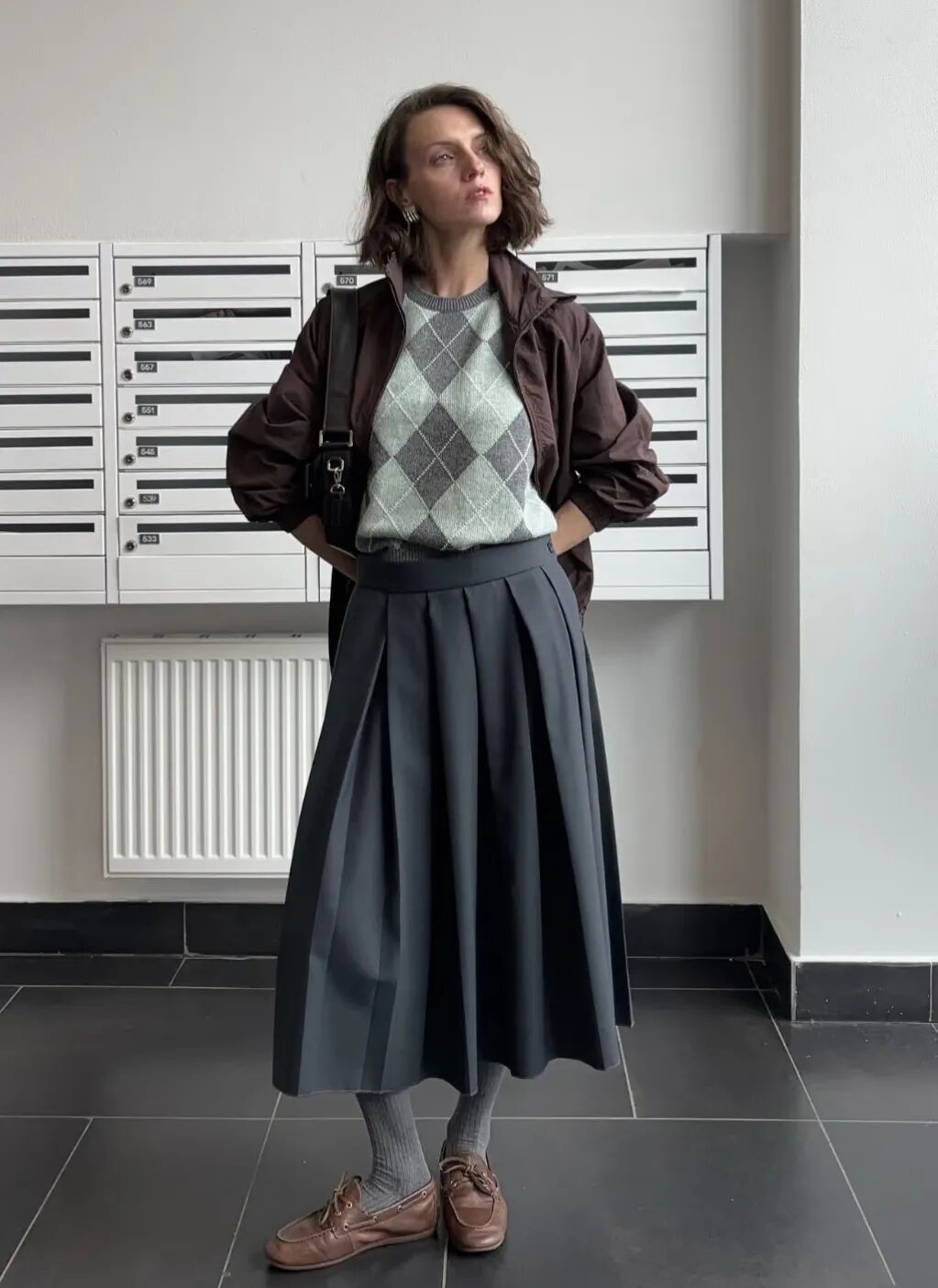 另外,深灰色的百褶短裙也是秋天的 “減齡”佳品。把它跟淺灰色毛衣還有灰色運動鞋搭配在一起,能展現出幾分“學院風“的氣息,輕松又減齡。
