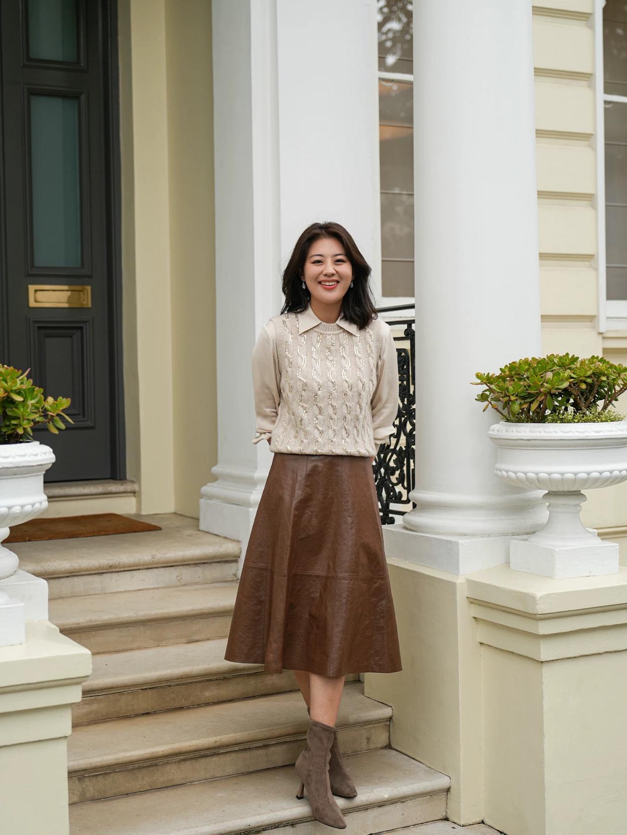 皮裙在秋天很受歡迎,自帶氛圍感穿在身上也有檔次,和針織毛衣進行組合,能夠完整“剛柔并濟”的效果。