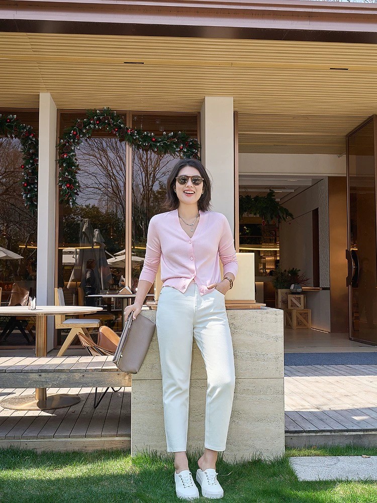 當粉色針織衫和白褲子進行組合,清新淡雅的氣息瞬間撲面而來,減齡顯嫩的配色,襯膚還抬氣色。