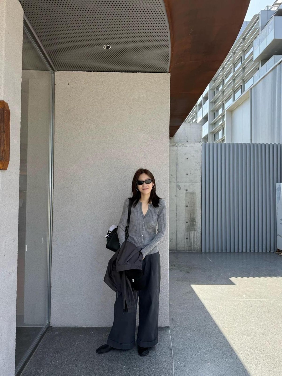 款式越基礎的單品,駕馭起來越輕松,修身款式的灰色針織衫勾勒曲線美,闊擺設計的西裝長褲,增添颯爽氣息。