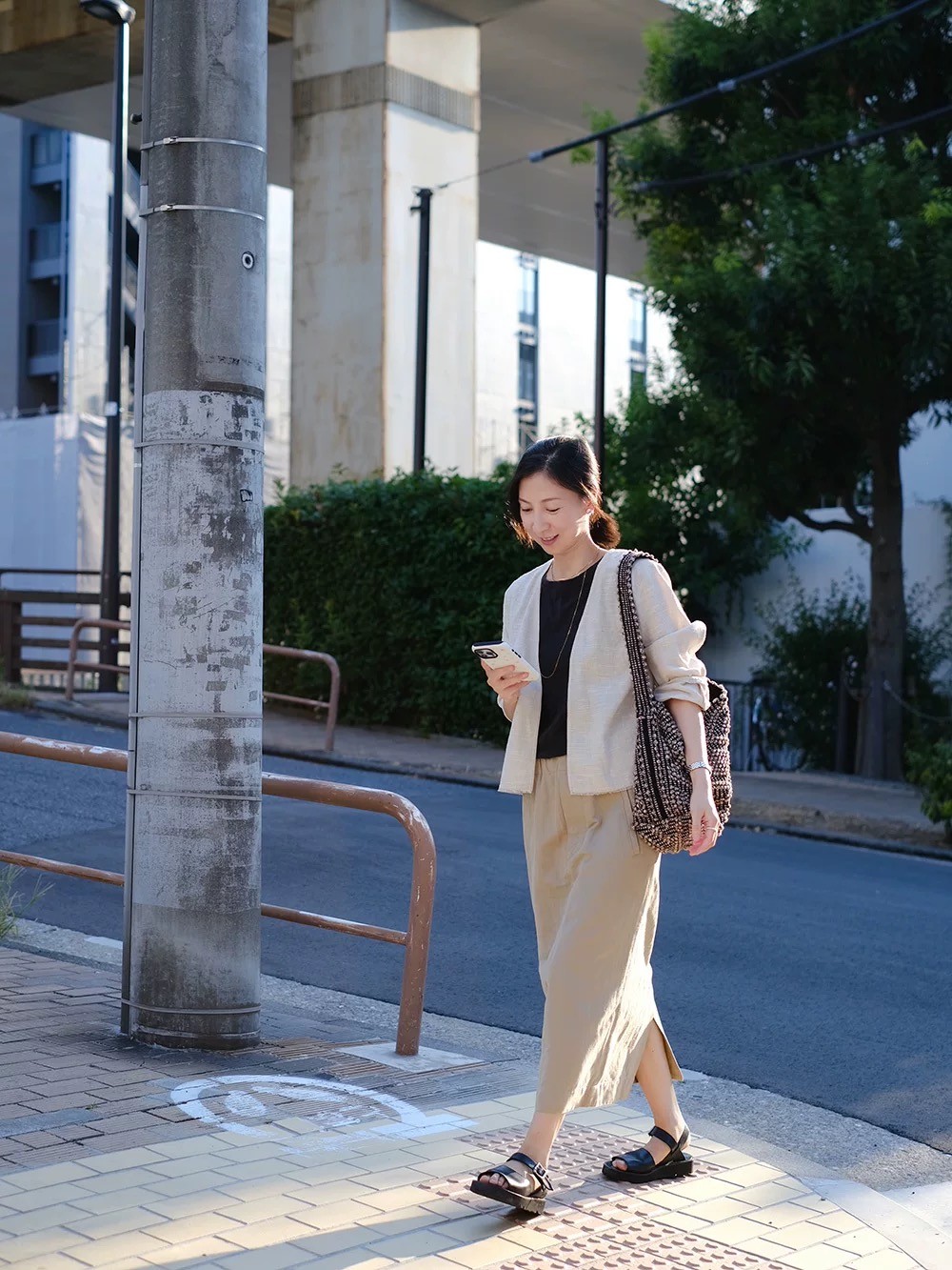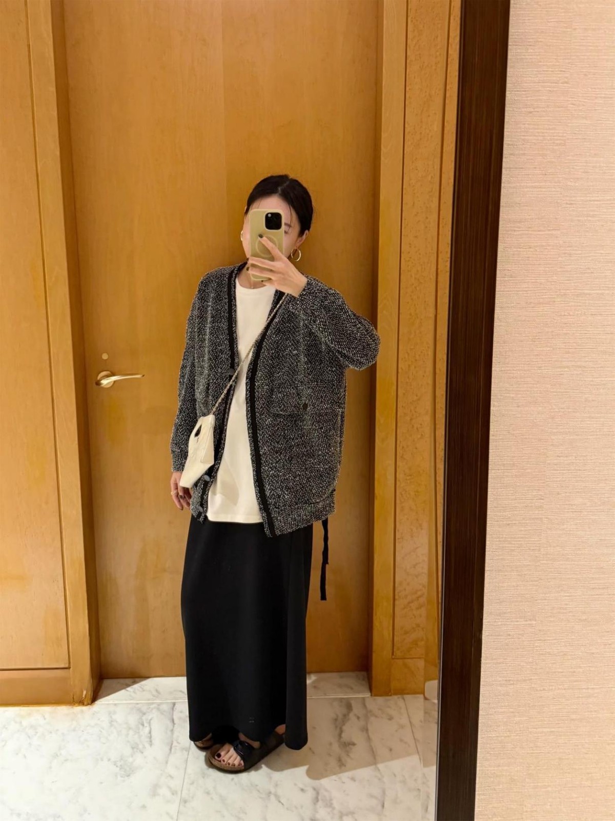 秋天其實很適合走慵懶路線,寬松版型的遮臀外套疊穿白T恤,盡顯松弛感,搭配及腳踝長度的小黑裙,舒適度拉滿。