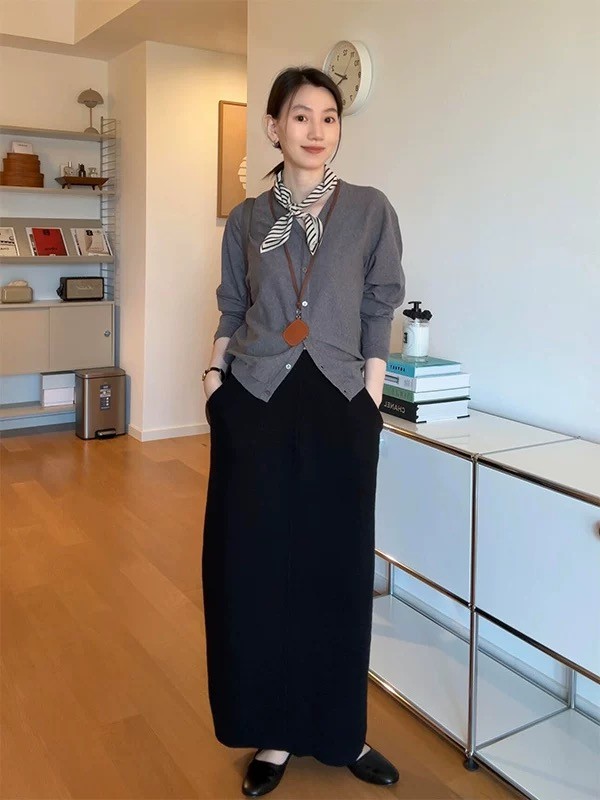 黑白灰經典永不過時,灰色奶奶衫配黑色直筒裙,系條魚骨紋絲巾,精致中又透著一絲貴氣感。