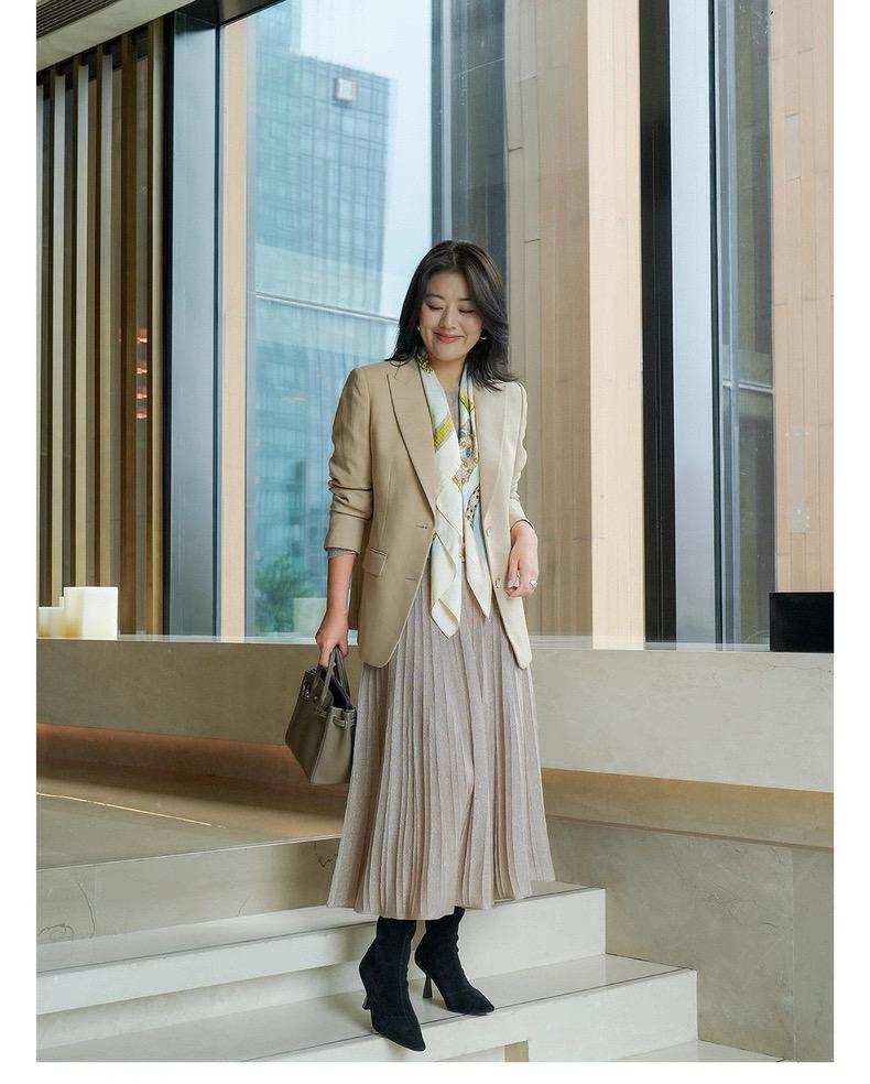 當西裝和風琴百褶長裙組合的那一刻,又美又颯的氣息撲面而來,在領口位置疊搭一條絲巾,更有層次感。