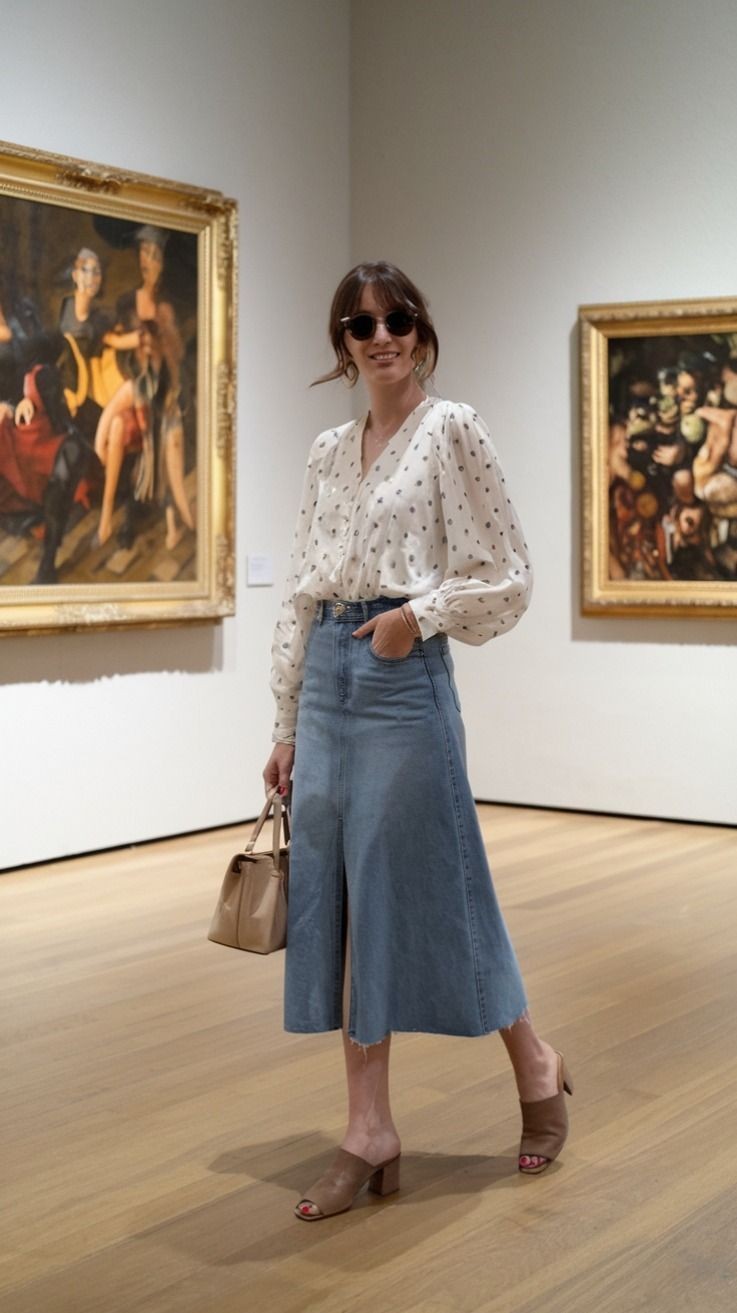 中年女人還要學會玩轉法式穿搭,波點元素的燈籠袖襯衣搭配牛仔開叉半身裙,適當的露膚,呼吸感十足。