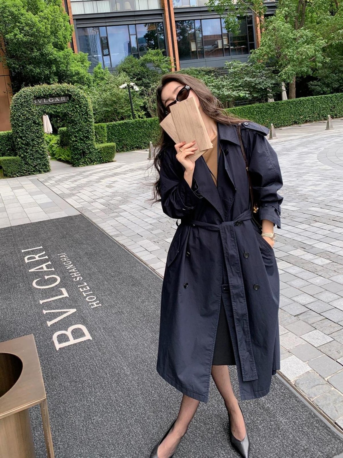 早秋時節,套上一件系帶款式的長風衣,疊穿連衣裙,直接將風衣當成裙子穿,配上黑絲性感又有格調。