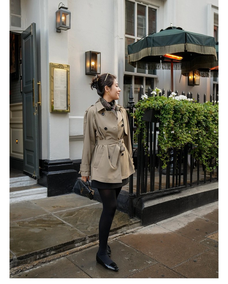小個子很適合穿短款系帶風衣,長度剛好遮住臀部,搭配短裙和黑色打底襪,配雙薄底鞋也特別顯腿長。