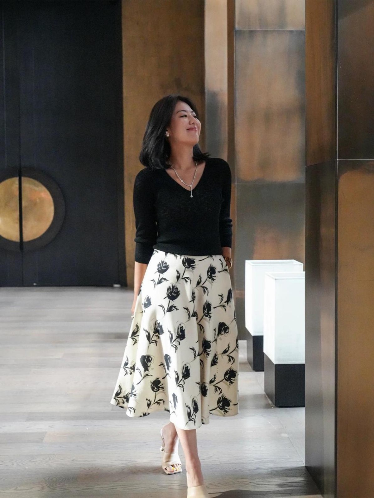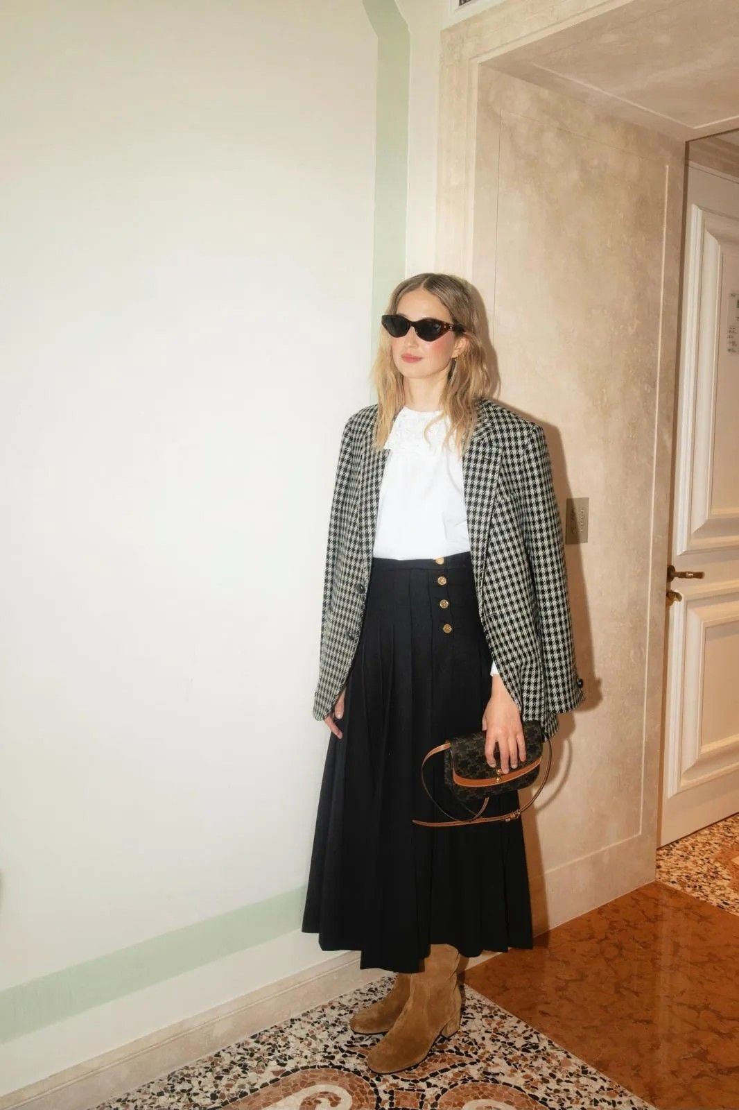 中年女人要懂得打造出“無齡感穿搭”,穿西裝不配西裝褲,換成直筒裙,干練利落又能透露出女人味。