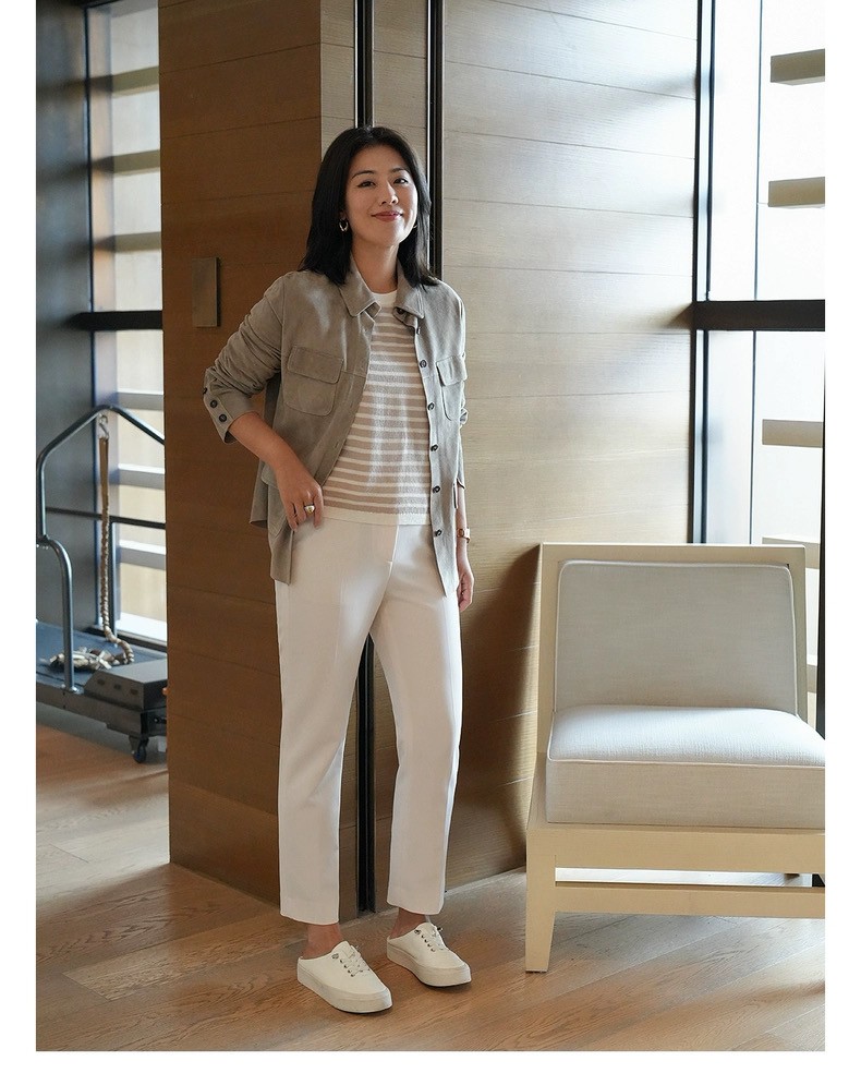 條紋衫疊搭襯衫,看似簡約實則耐看又有格調,配條白色煙管褲,簡潔大方還不易過時,久穿不膩。