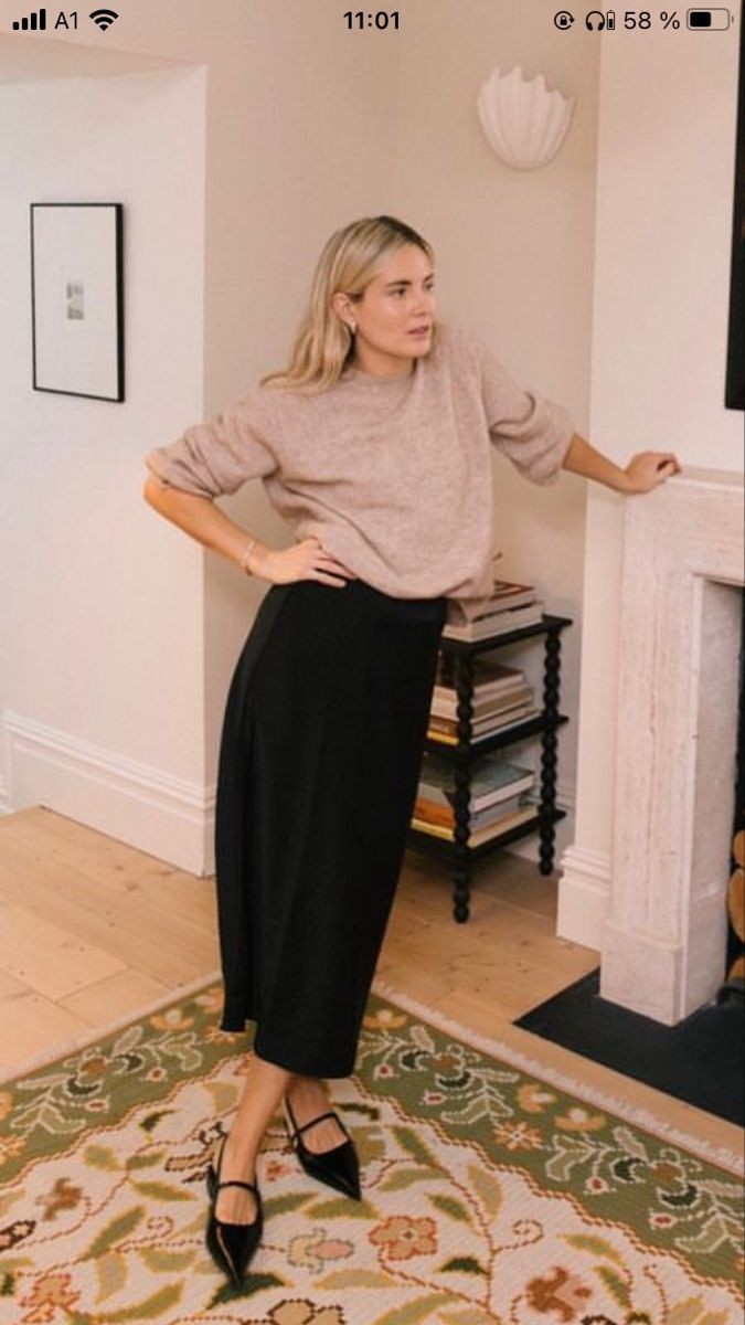 整體配色都很簡單的情況下,服裝單品要帶點設計感,例如尖頭款式的綁帶薄底鞋,就算是配基礎款毛衣和直筒裙也很美。