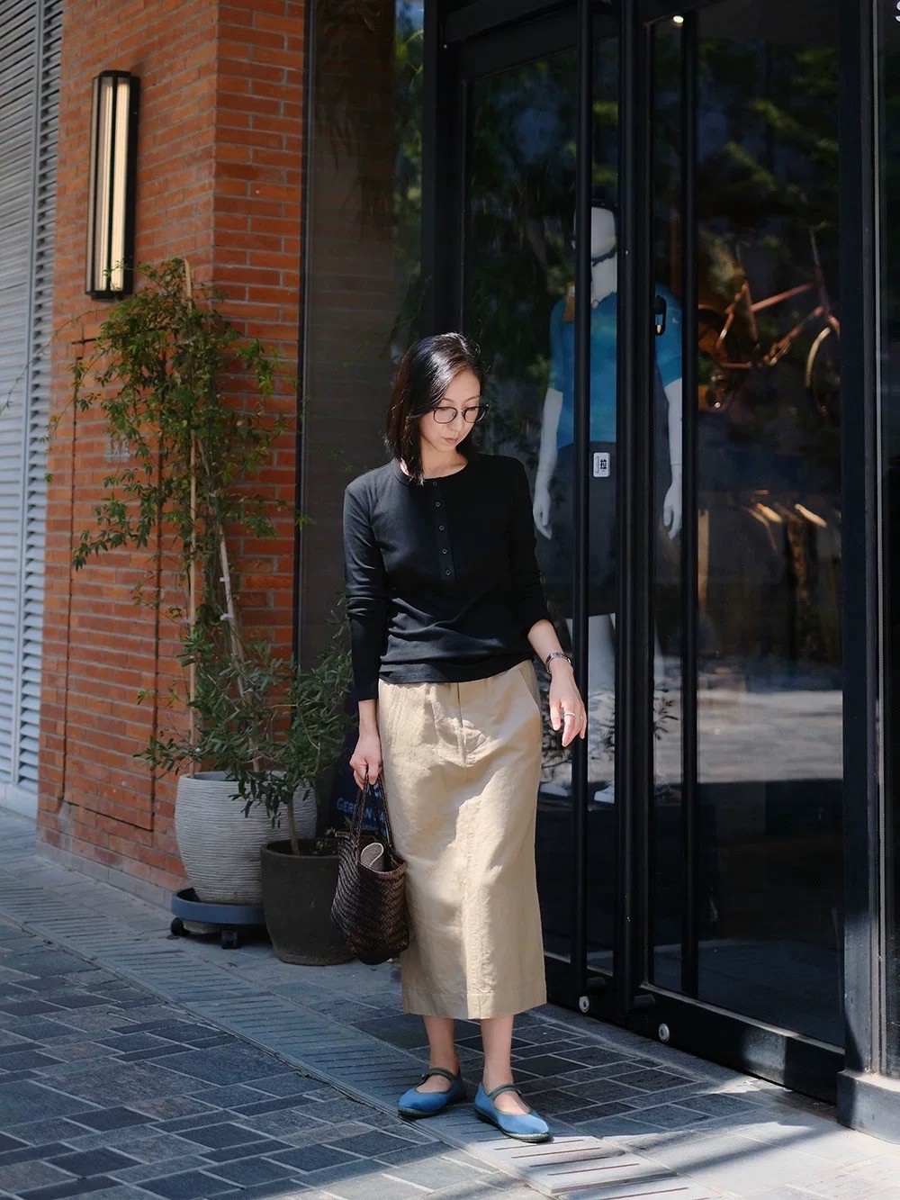 修身款式的黑色上衣,視覺上可以顯瘦一圈,搭配卡其色直筒長裙,讓彩色鞋子成為“主角”,吸引力拉滿!