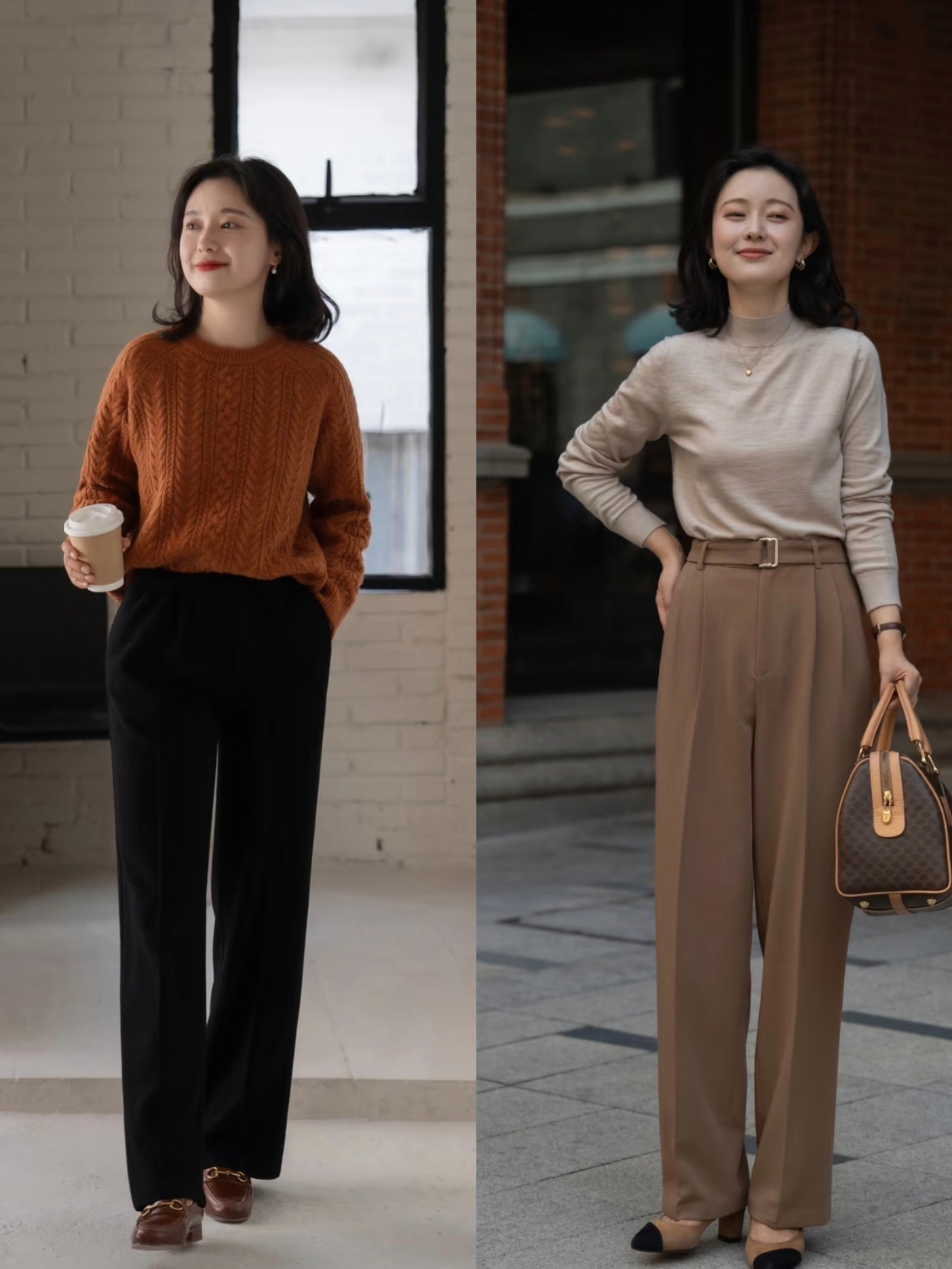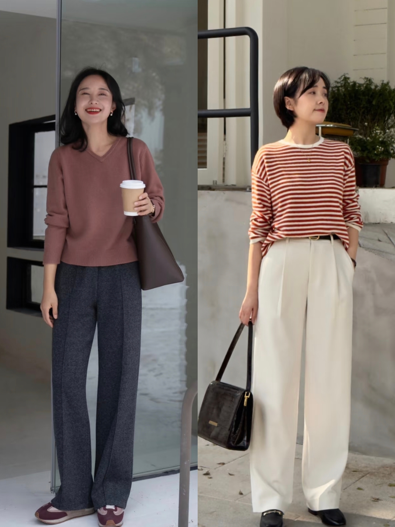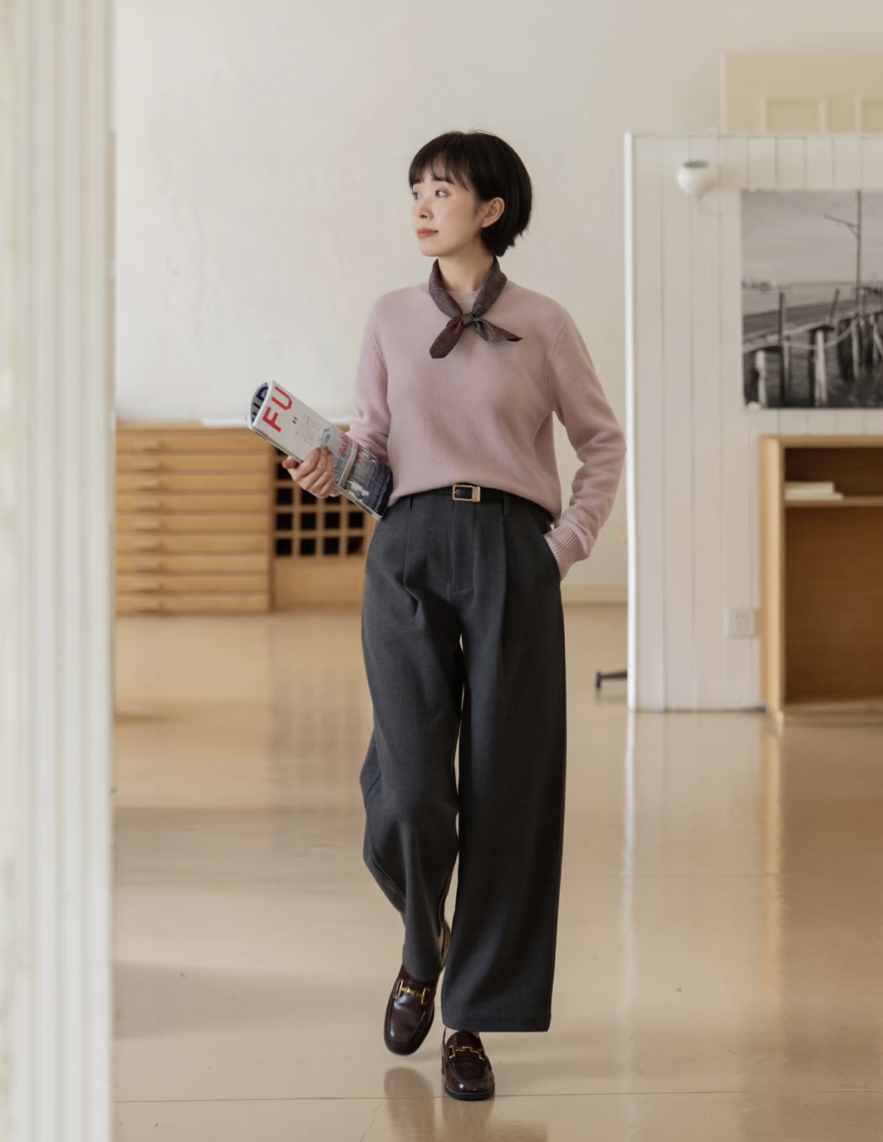 若想打造溫柔氣質(zhì),西裝闊腿褲與棕色樂福鞋的組合堪稱點睛之筆,搭配柔粉色毛衣,過渡季節(jié)穿既保暖又不失優(yōu)雅,輕松穿出法式慵懶感。