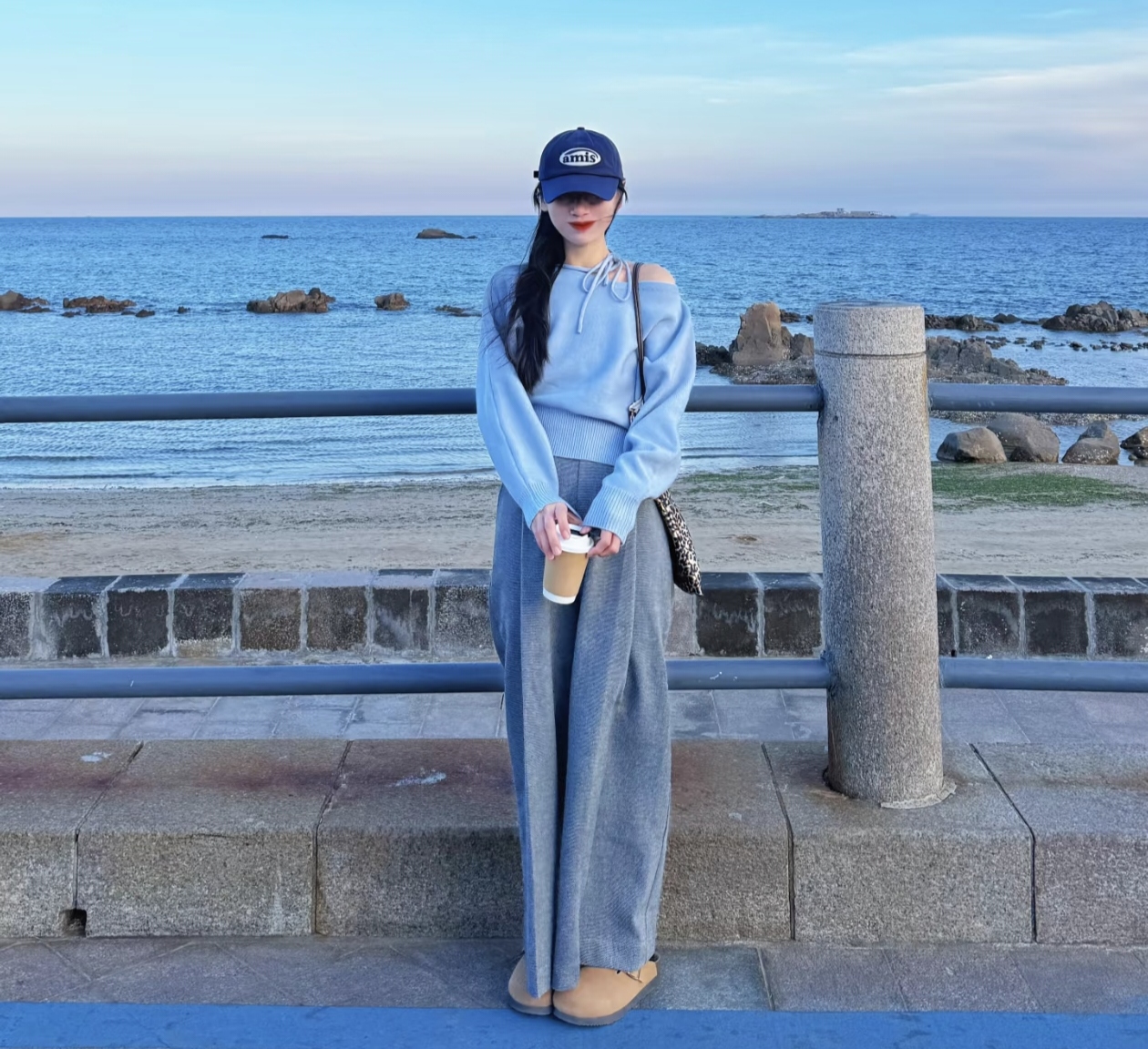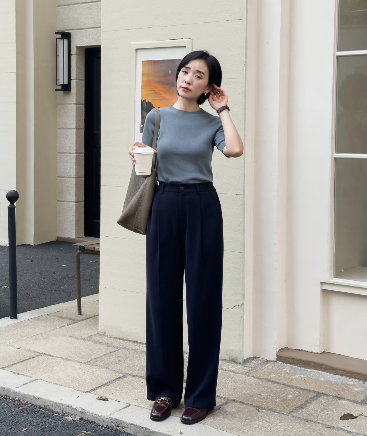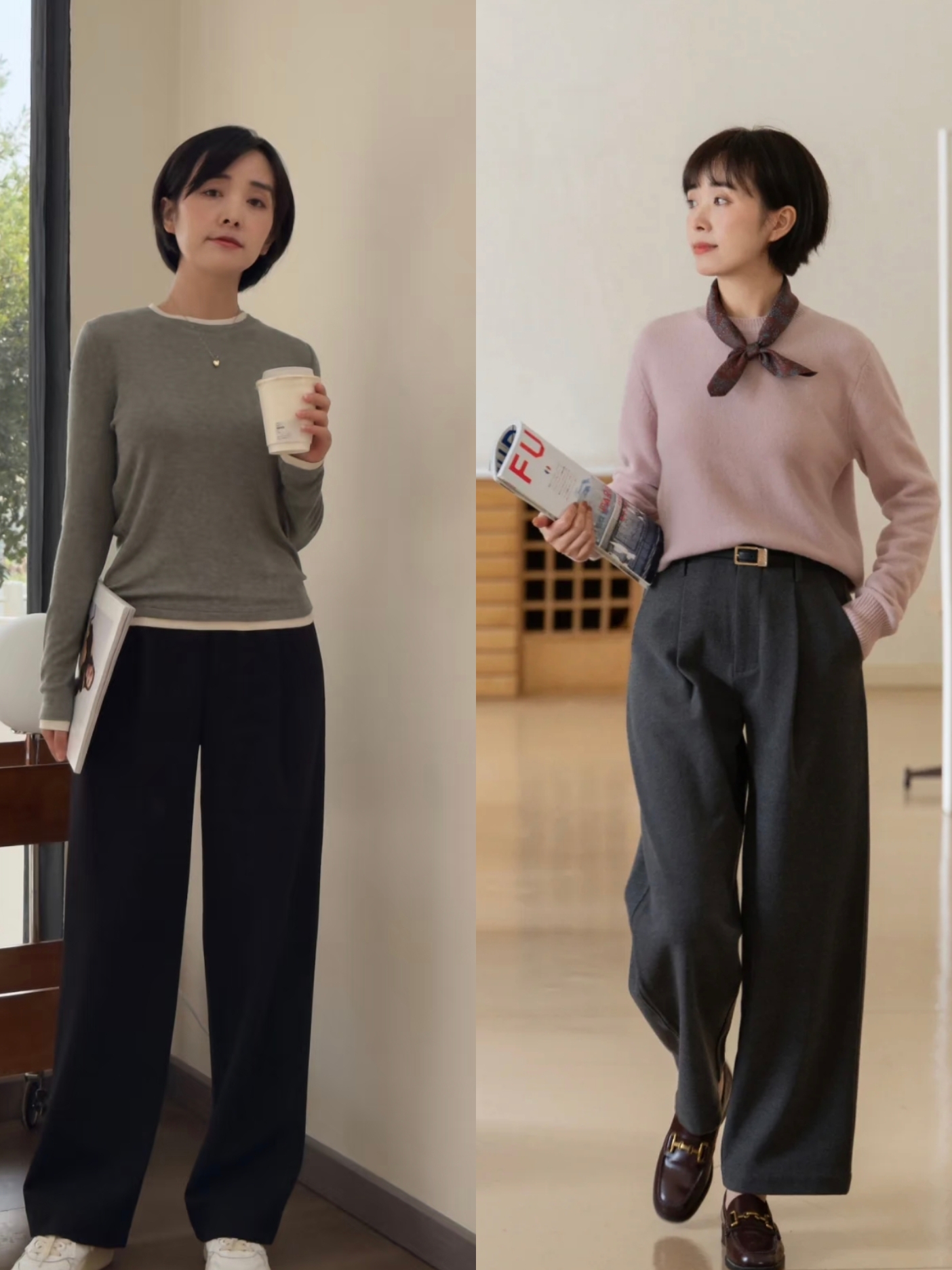 若想打造溫柔氣質(zhì),西裝闊腿褲與棕色樂福鞋的組合堪稱點睛之筆,搭配柔粉色毛衣,過渡季節(jié)穿既保暖又不失優(yōu)雅,輕松穿出法式慵懶感。