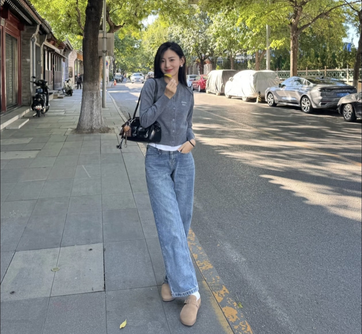 灰色薄款針織開衫,疊穿基礎(chǔ)款白色T恤,露出下擺增加層次感,搭配常規(guī)牛仔長褲,日常隨性又舒適。