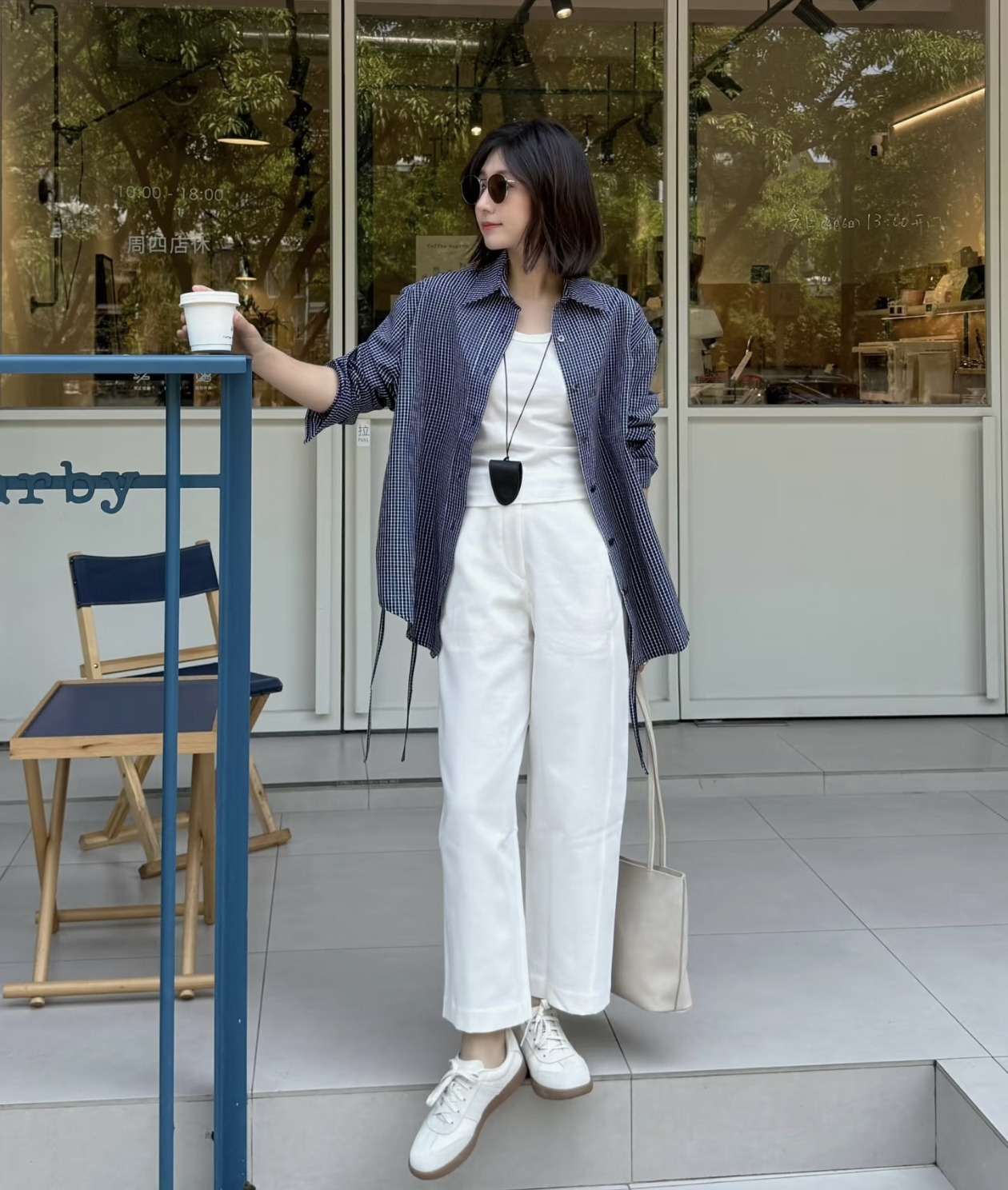 格子襯衫內(nèi)搭白色吊帶,再配上白色闊腿褲和德訓(xùn)鞋,松弛自在,又很干凈清爽,無論是通勤上班還是日常出行都很好看。