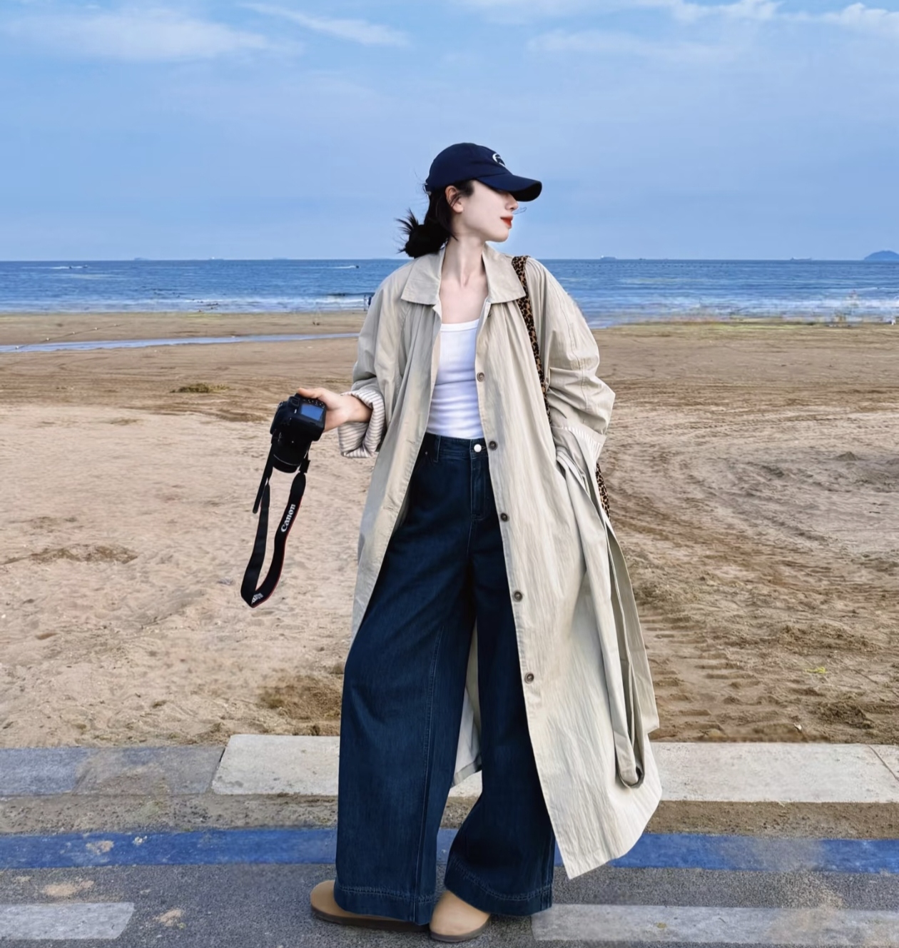 寬松版型的長款風(fēng)衣,內(nèi)搭緊身打底是避免拖沓的關(guān)鍵,加入藍(lán)色牛仔闊腿褲和厚底勃肯鞋,顯高顯瘦。