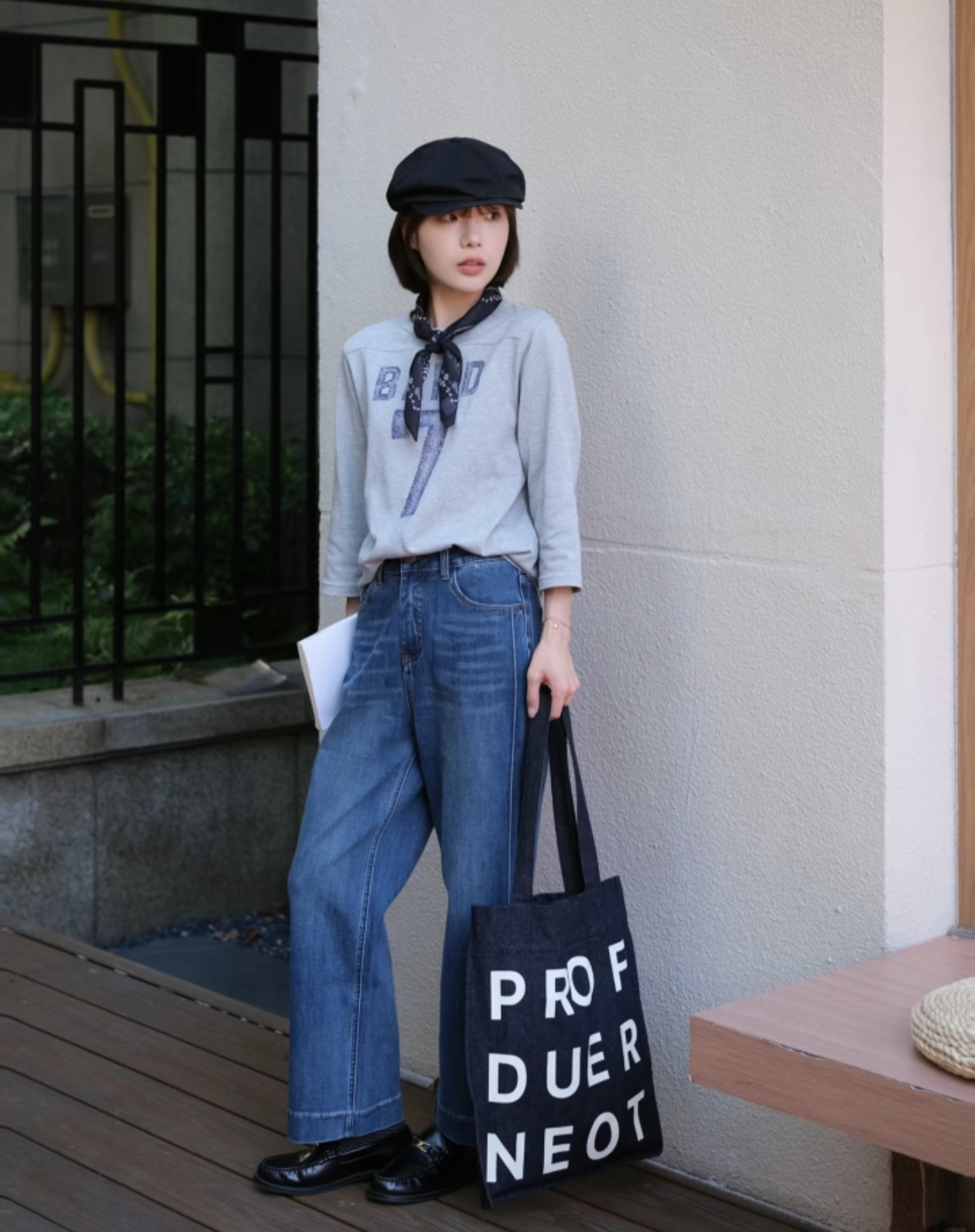 此外,還可以選擇深灰色T恤搭配牛仔闊腿褲和黑色樂福鞋,加入絲巾和貝雷帽進(jìn)行點綴,時髦中又透著一股復(fù)古韻味。