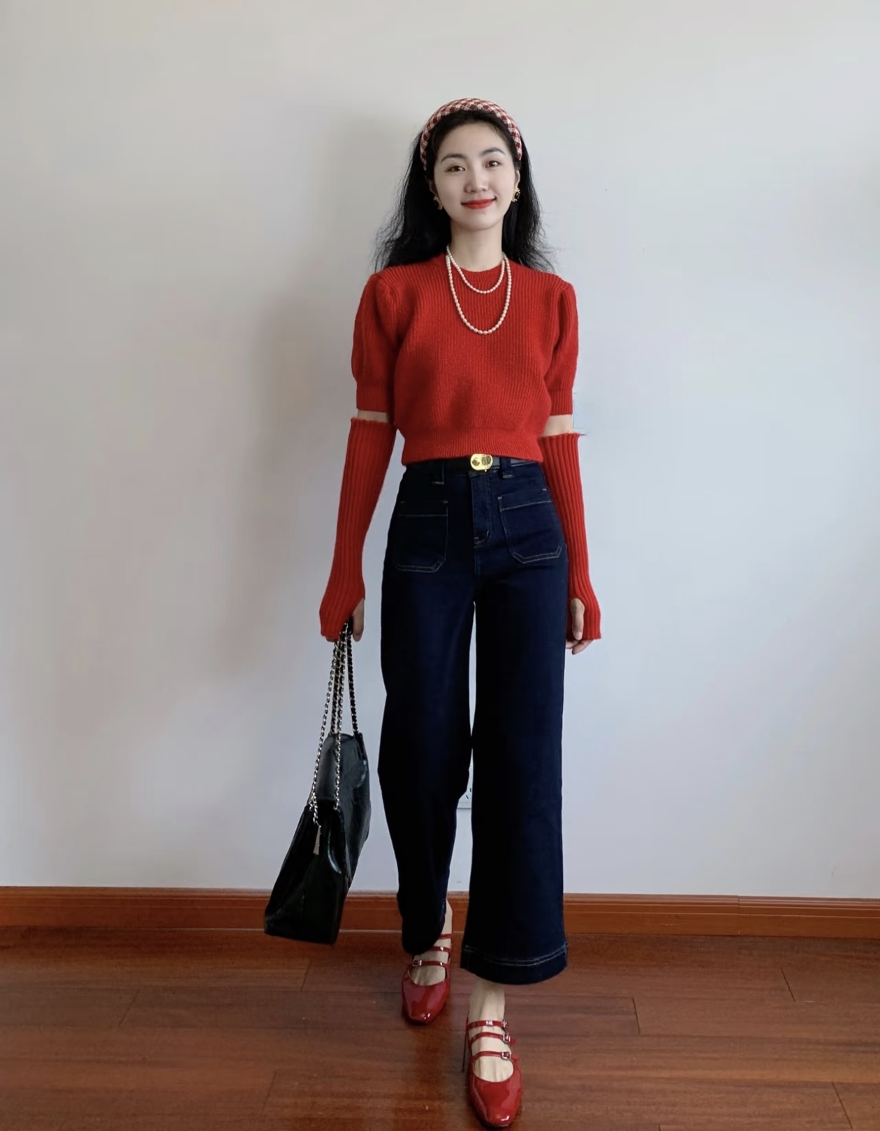 闊腿褲若是不想穿得太休閑隨性,可以嘗試選擇一雙紅色瑪麗珍皮鞋來搭配,呼應(yīng)上衣顏色,尤其適配職場場景。