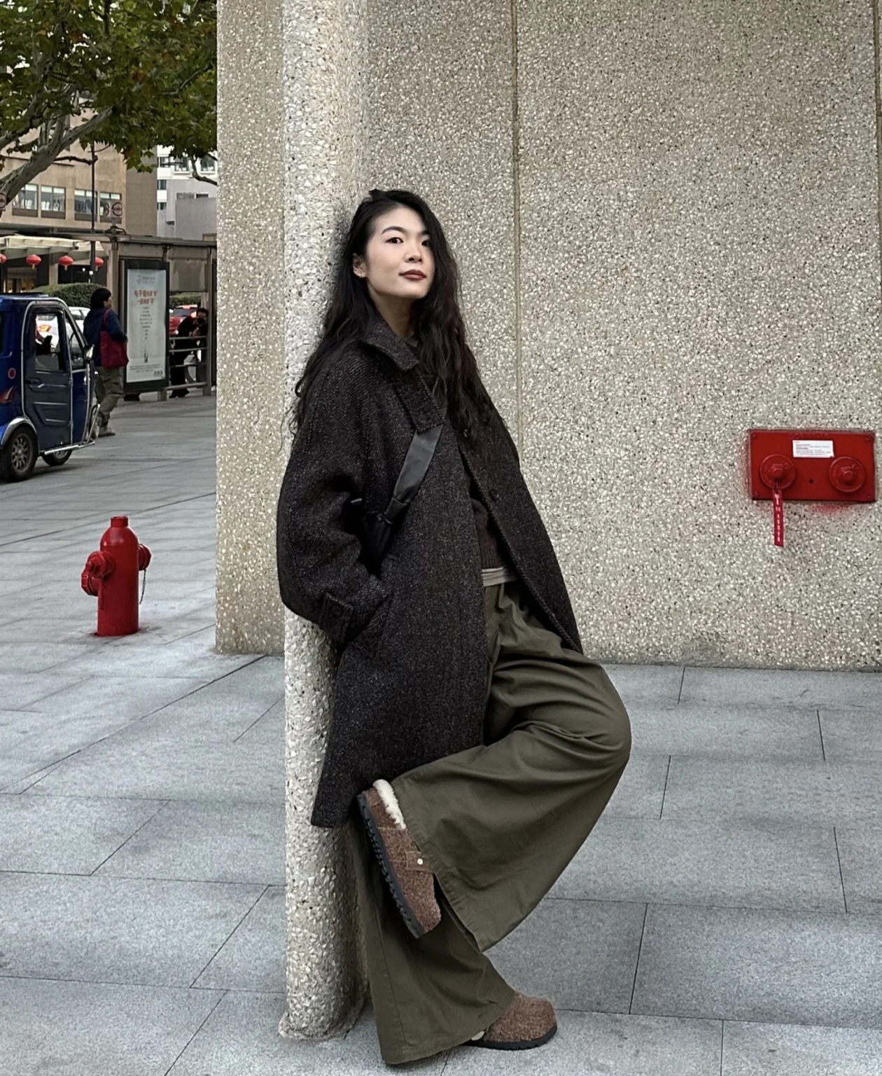 經(jīng)典耐看的美拉德穿搭,咖色闊腿褲搭配深咖色大衣,搭配加絨款式的厚款勃肯鞋,既保暖又好看。