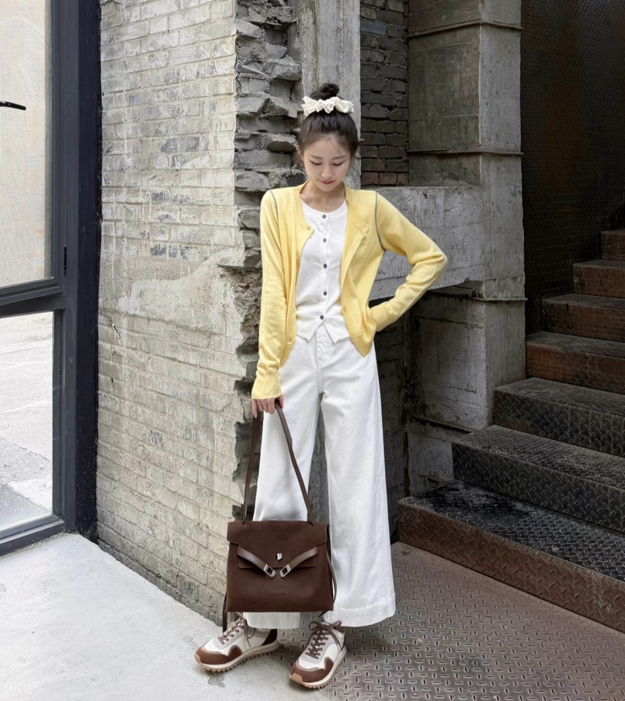 若是個子不高的女生,可以選擇厚底的選擇,搭配清新的白色闊腿褲和黃色針織開衫,減齡又顯白。