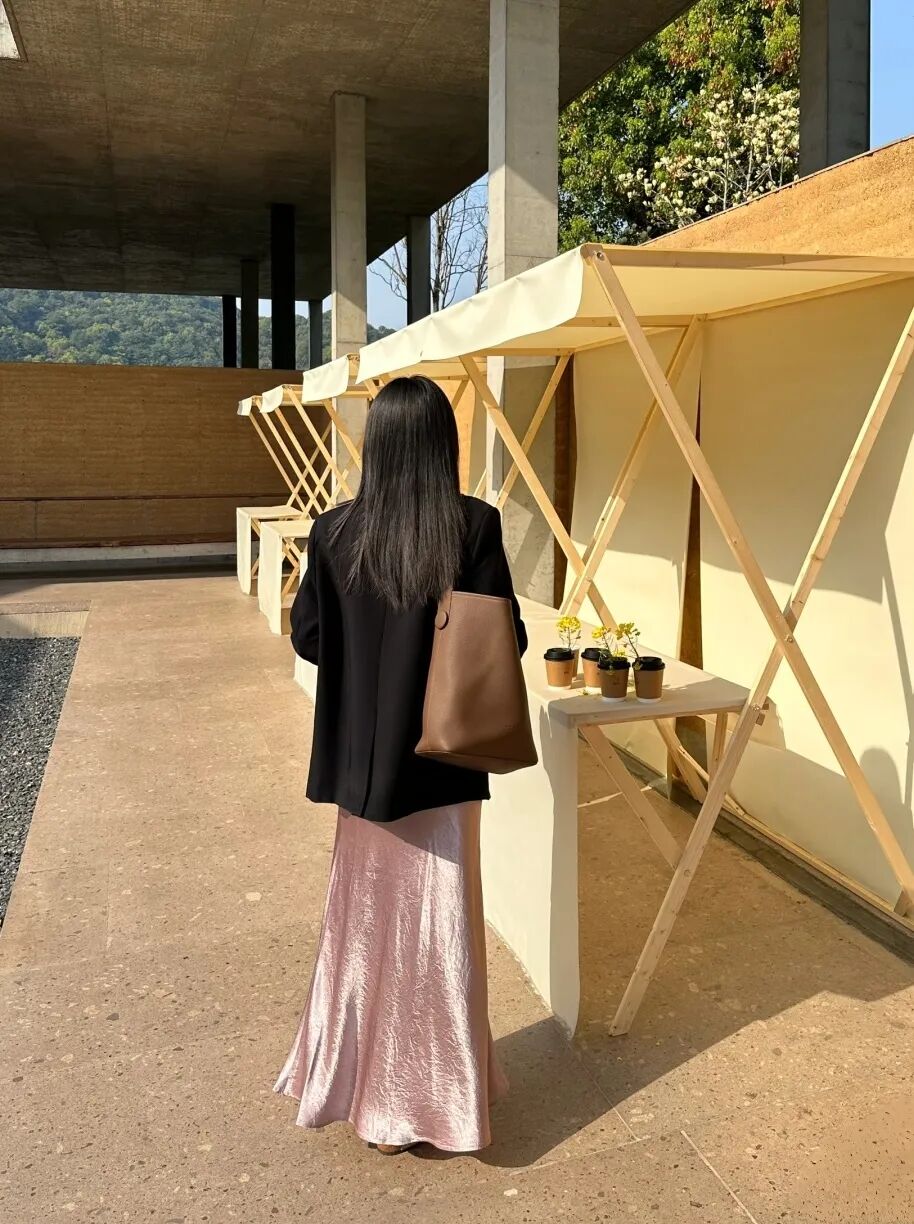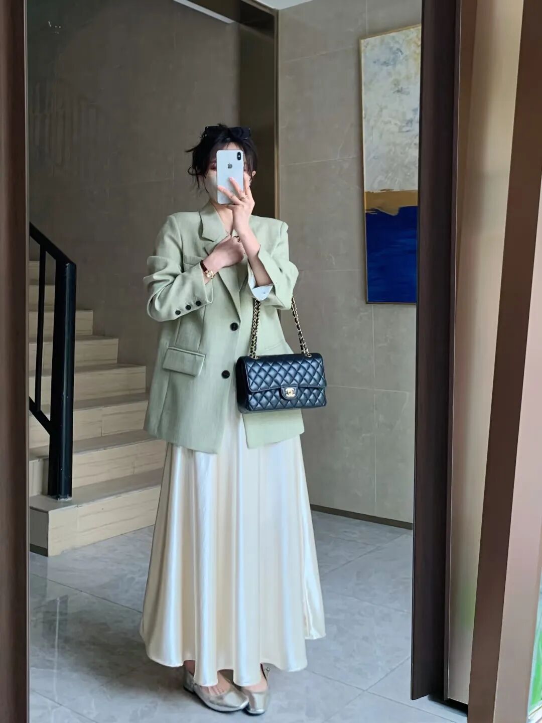 淺綠色西裝疊穿白色襯衫,寬松版型慵懶又不失干練,搭配米白色緞面長裙,絲滑材質自帶高級濾鏡,簡約中透著精致感。這套搭配無論是上班通勤還是約會聚餐,都能讓你成為焦點。