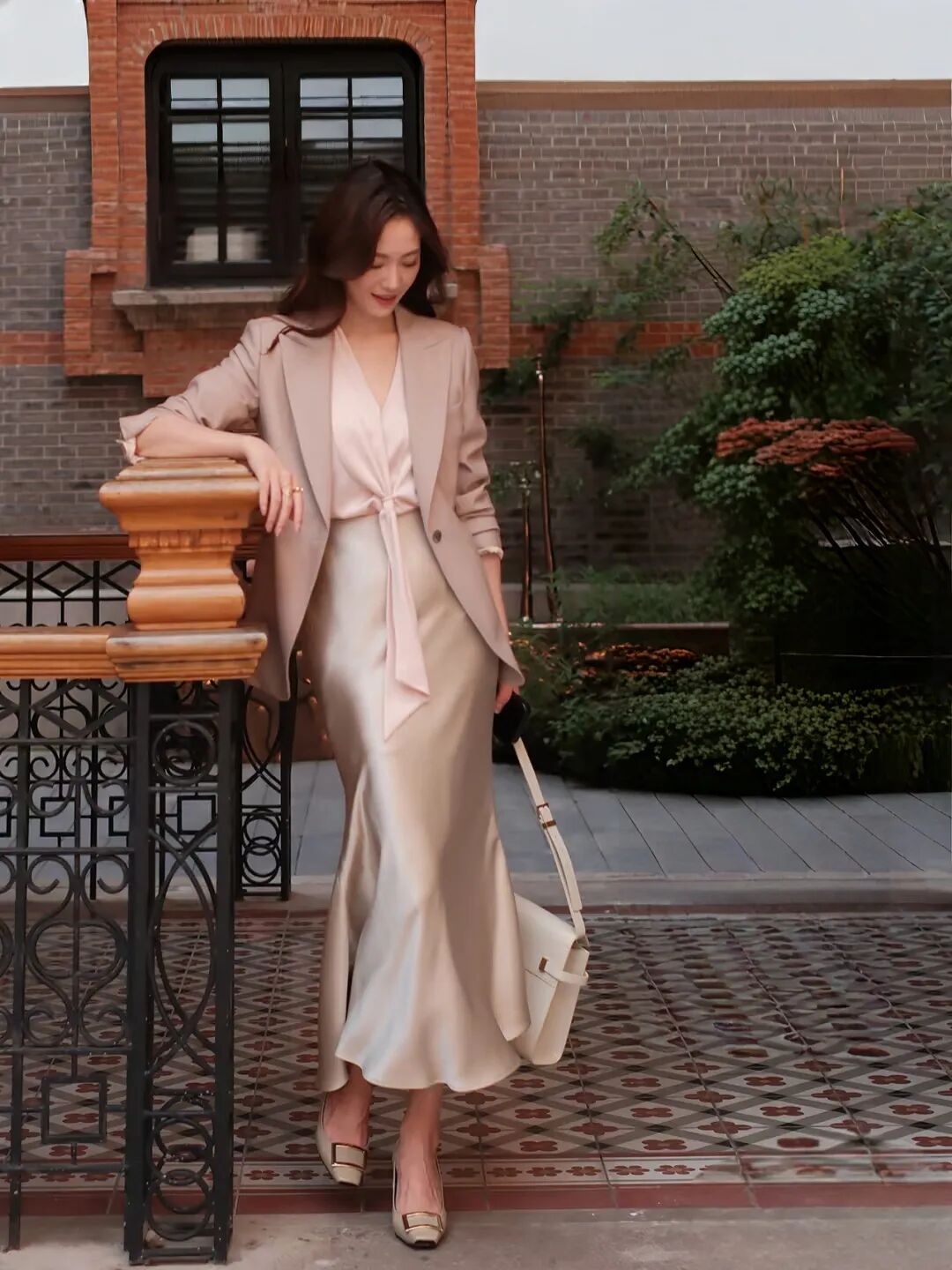 淺粉色西裝溫柔顯氣質,內搭同色系緞面系帶上衣,勾勒出優美的頸部線條。搭配修身的魚尾裙,完美凸顯身材曲線,裙擺的魚尾設計優雅又性感。這套搭配特別適合晚宴或重要場合,讓你成為全場最迷人的存在。