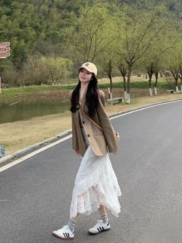 卡其色西裝經典百搭不挑人,內搭白色鏤空蕾絲裙自帶浪漫氛圍,多層設計增加穿搭層次感。這套搭配完美融合了西裝的干練與蕾絲的柔美,輕松穿出與眾不同的混搭感,特別適合周末出游或閨蜜聚會。
