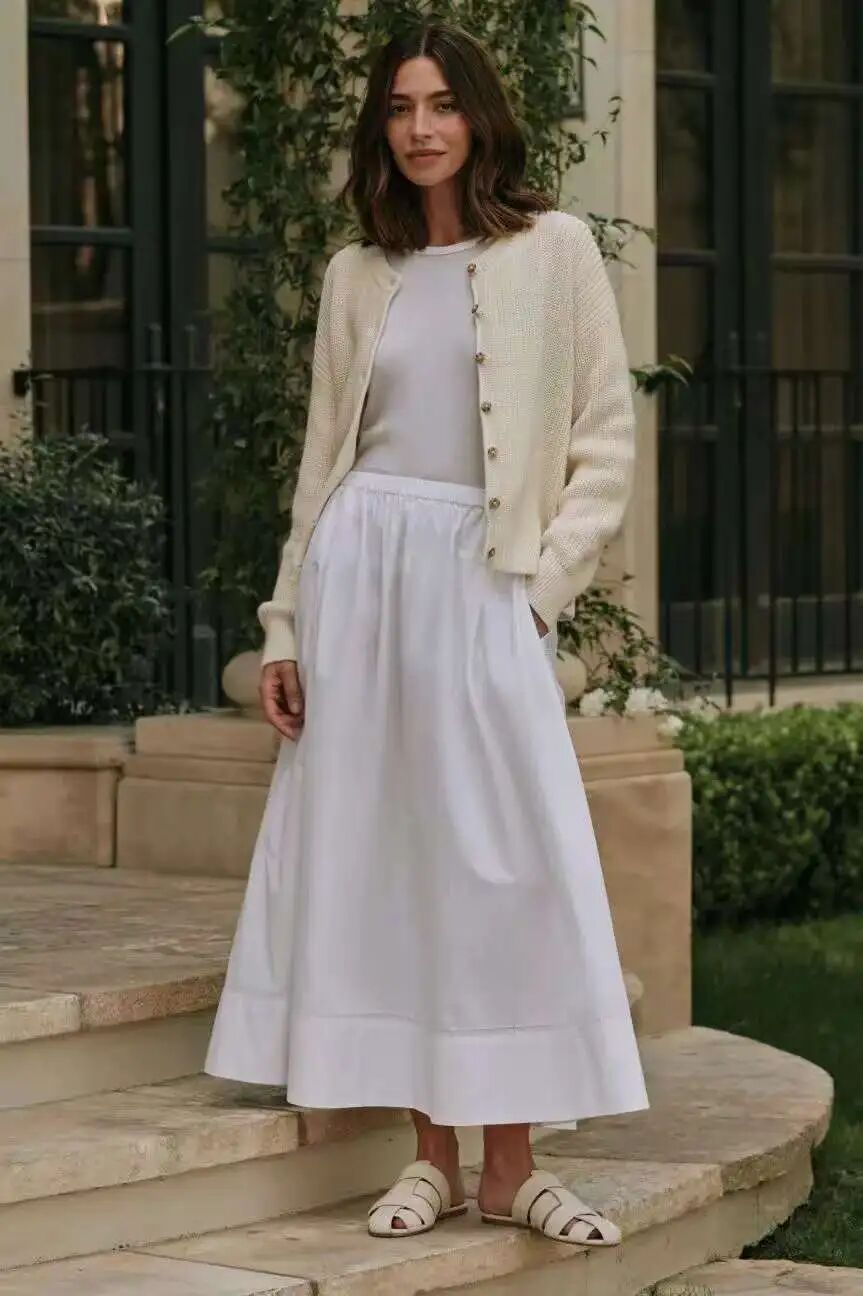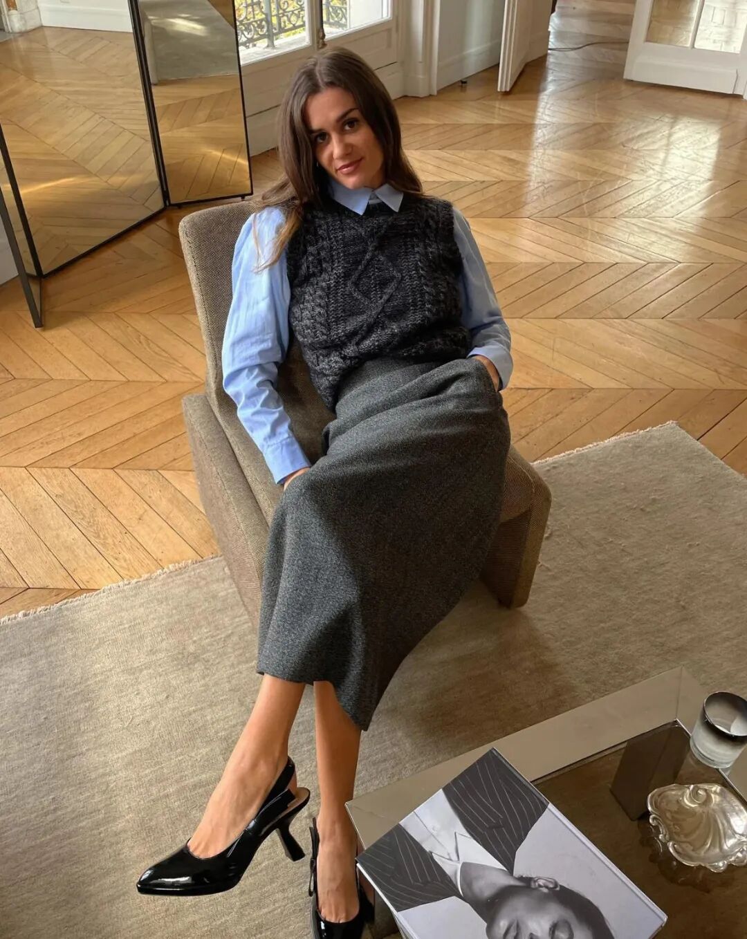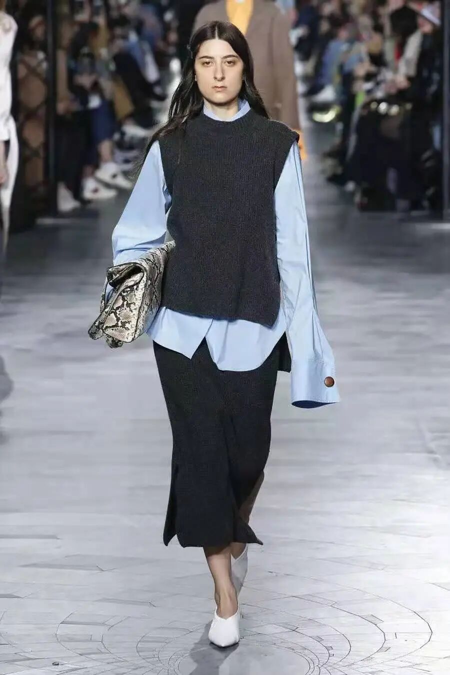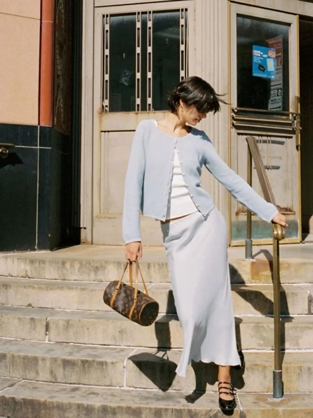 將內(nèi)搭的T恤替換成襯衫也很好看,如果下裝搭配半裙的話,請注意整體配色盡量維持簡潔,選擇和針織衫同色系的直筒半裙是最恰當、最能穿出高級感的。