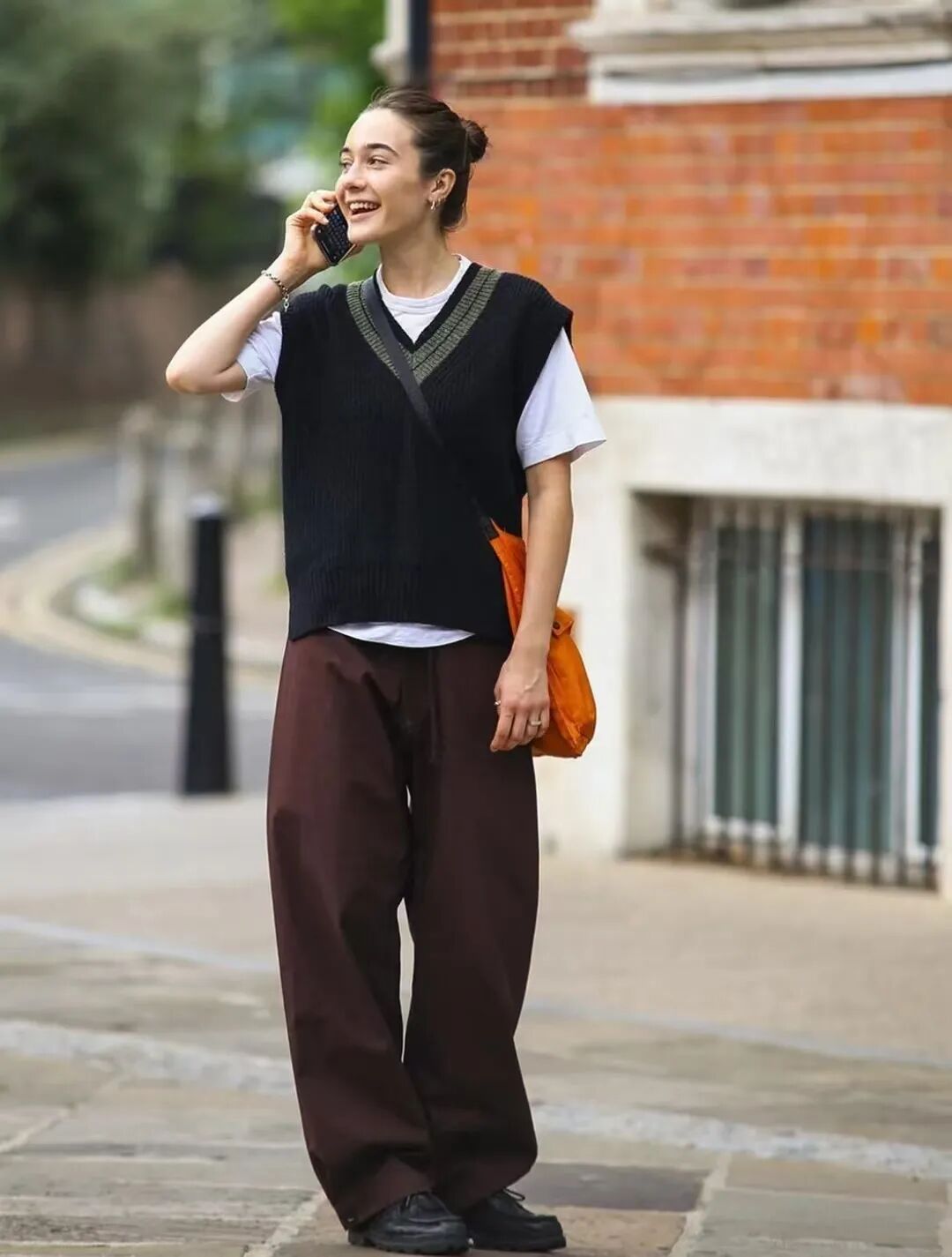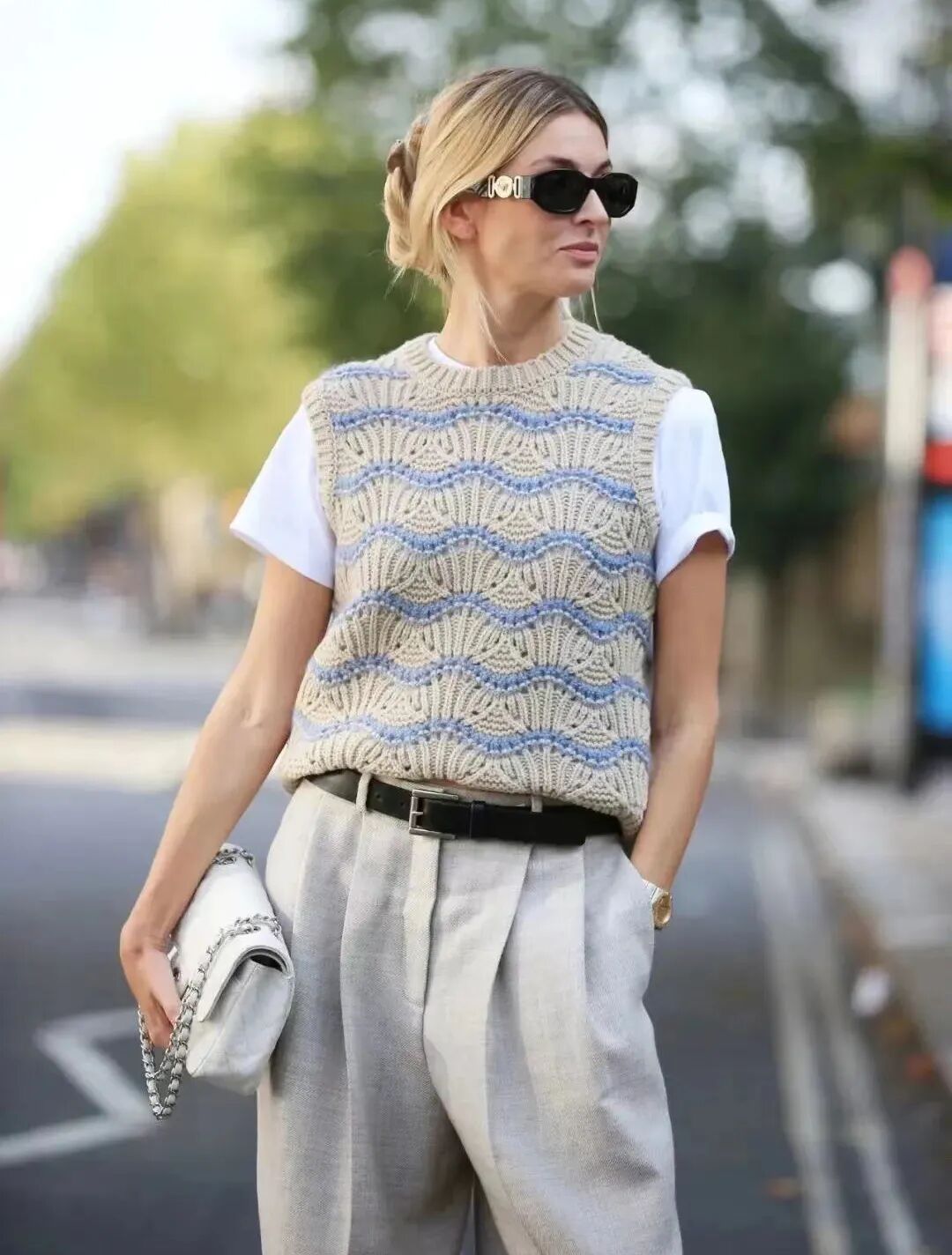 針織馬甲絕對是秋天疊穿的王牌單品。早秋的天氣仍然適合穿T恤,然后在T恤上面疊穿一件V領針織馬甲,下裝搭配牛仔褲或者西褲,整個造型干凈利落,還帶幾分清爽的書卷氣,簡單又有層次感,時髦好看不挑年齡。
