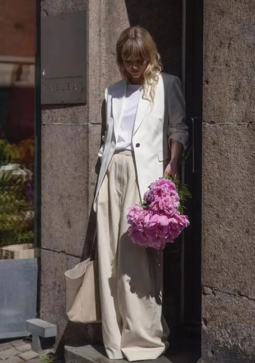 白色西裝+白T恤+米白色闊腿褲,近似色系的疊穿,簡約優(yōu)雅也不失層次感。