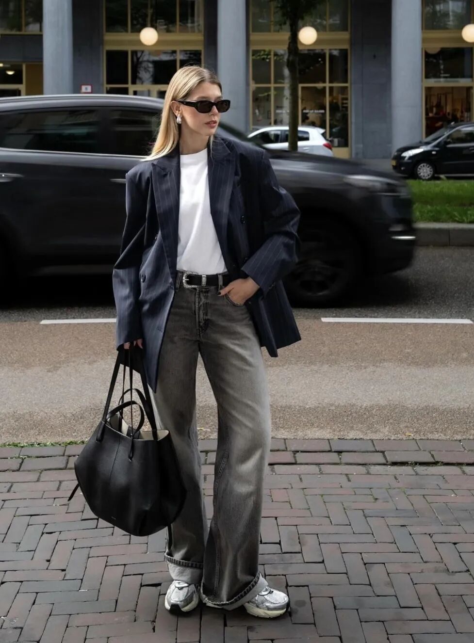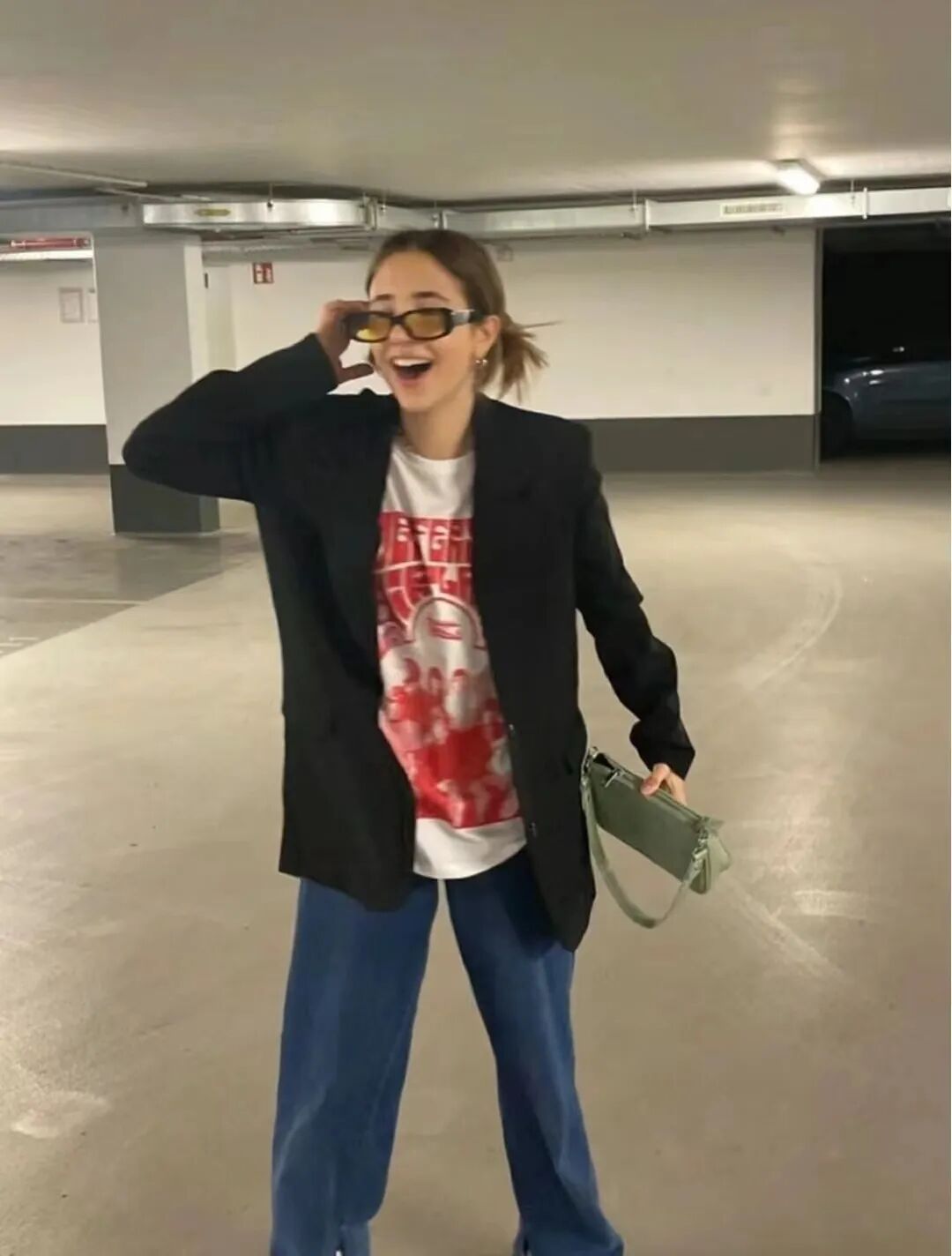 內(nèi)搭的白T恤也可以選擇帶有彩色圖案的款式,加上黑色西裝外套和牛仔褲,整個造型既優(yōu)雅得體又能巧妙地表達自己的個性和時尚態(tài)度。
