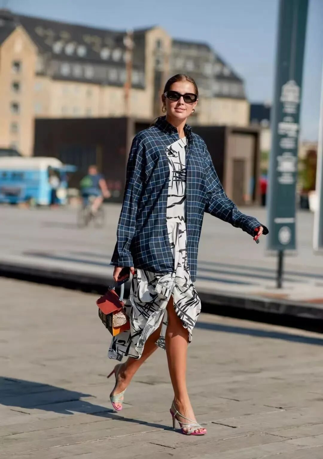黑白印花連衣裙疊穿深藍色的格子襯衫,溫柔優(yōu)雅又不失帥氣隨性,也是別出心裁的時髦。