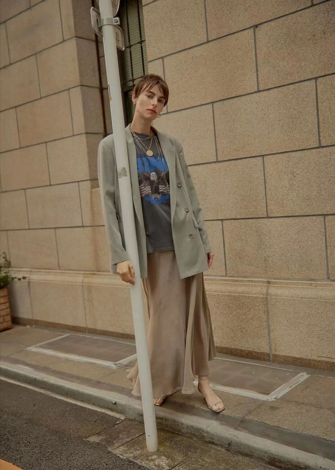 秋天西裝穿裙裝的朋友,也可以讓裙子加入到“西裝+T恤”的造型之中。無論是飄逸的長裙,還是利落的短裙,都可以為西裝造型注入一份優(yōu)雅。