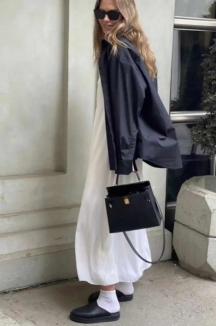 讓夏天的連衣裙在秋季發(fā)揮余熱,只需要再套上一件襯衫,不用花費太多心神,就能穿出那種慵懶自在的氛圍感。