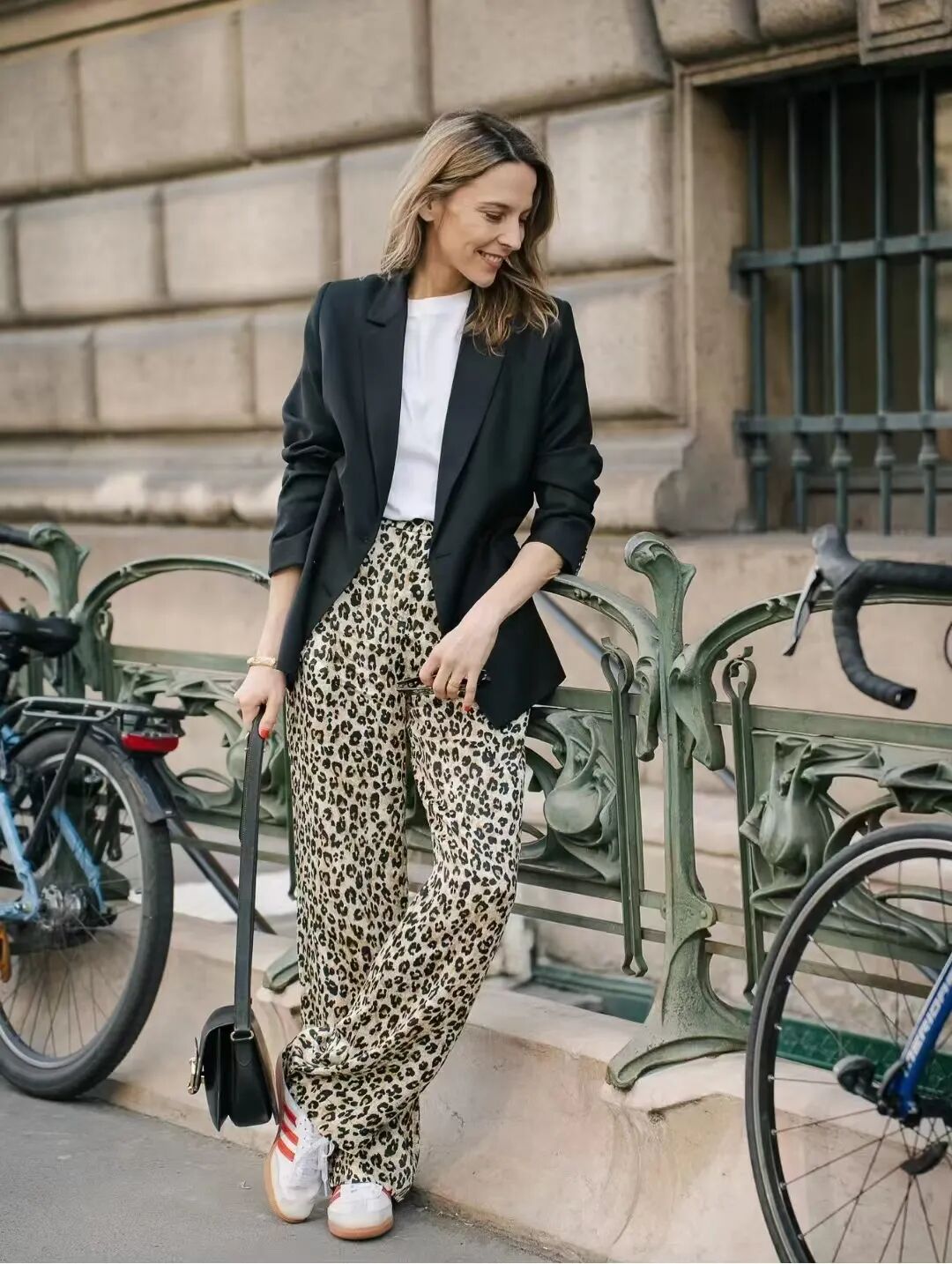如果想穿出更獨特的風格,在黑西裝內(nèi)搭白T恤的基礎上,搭配一條豹紋闊腿褲,絕對夠搶眼,再加一雙輕便舒適的運動鞋,時髦感輕松拿捏。