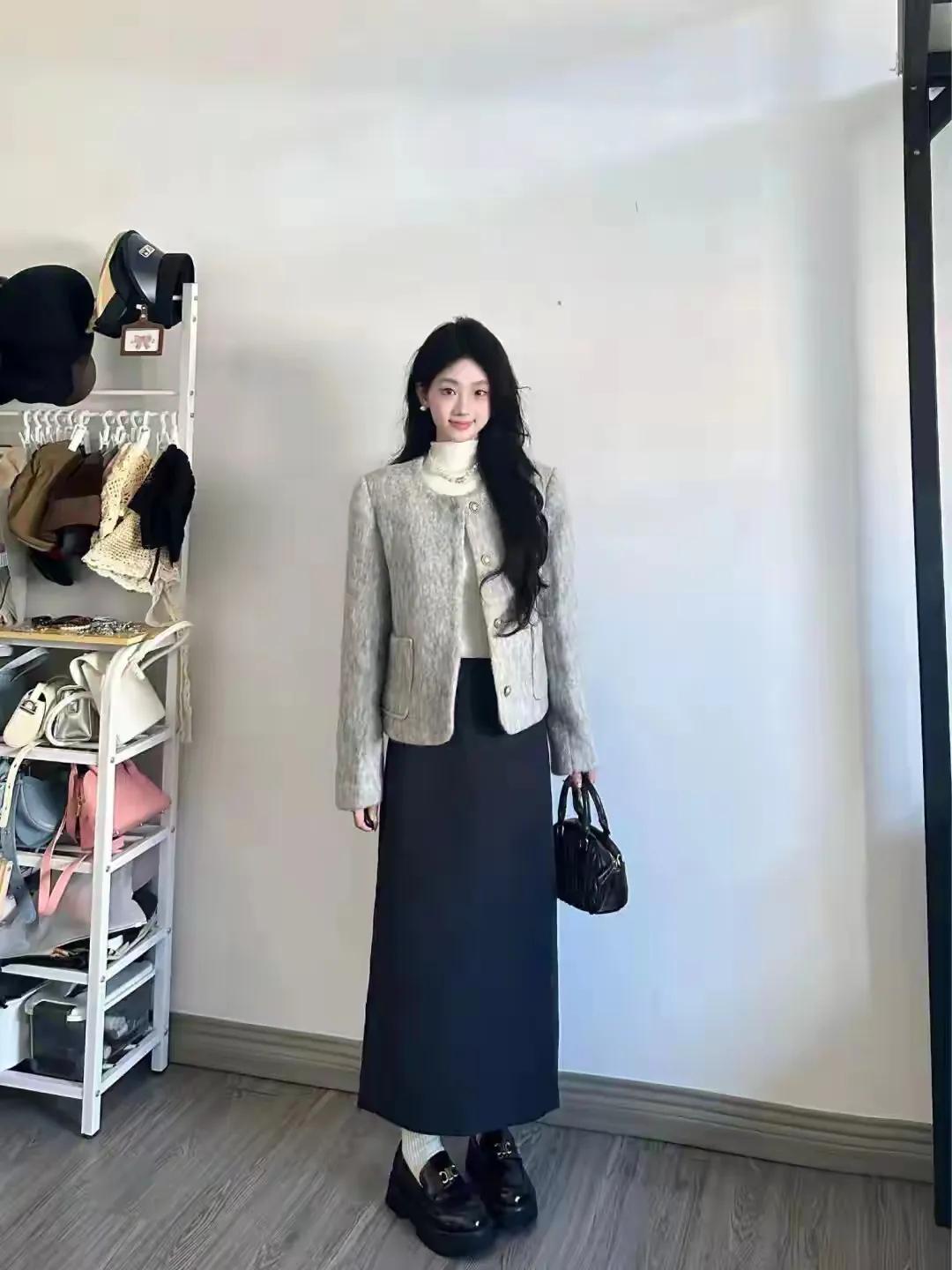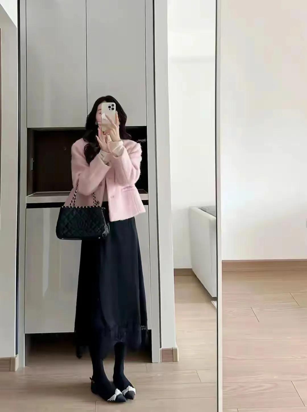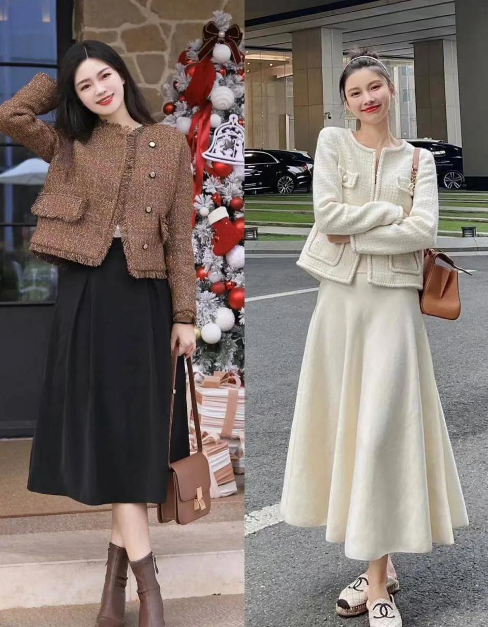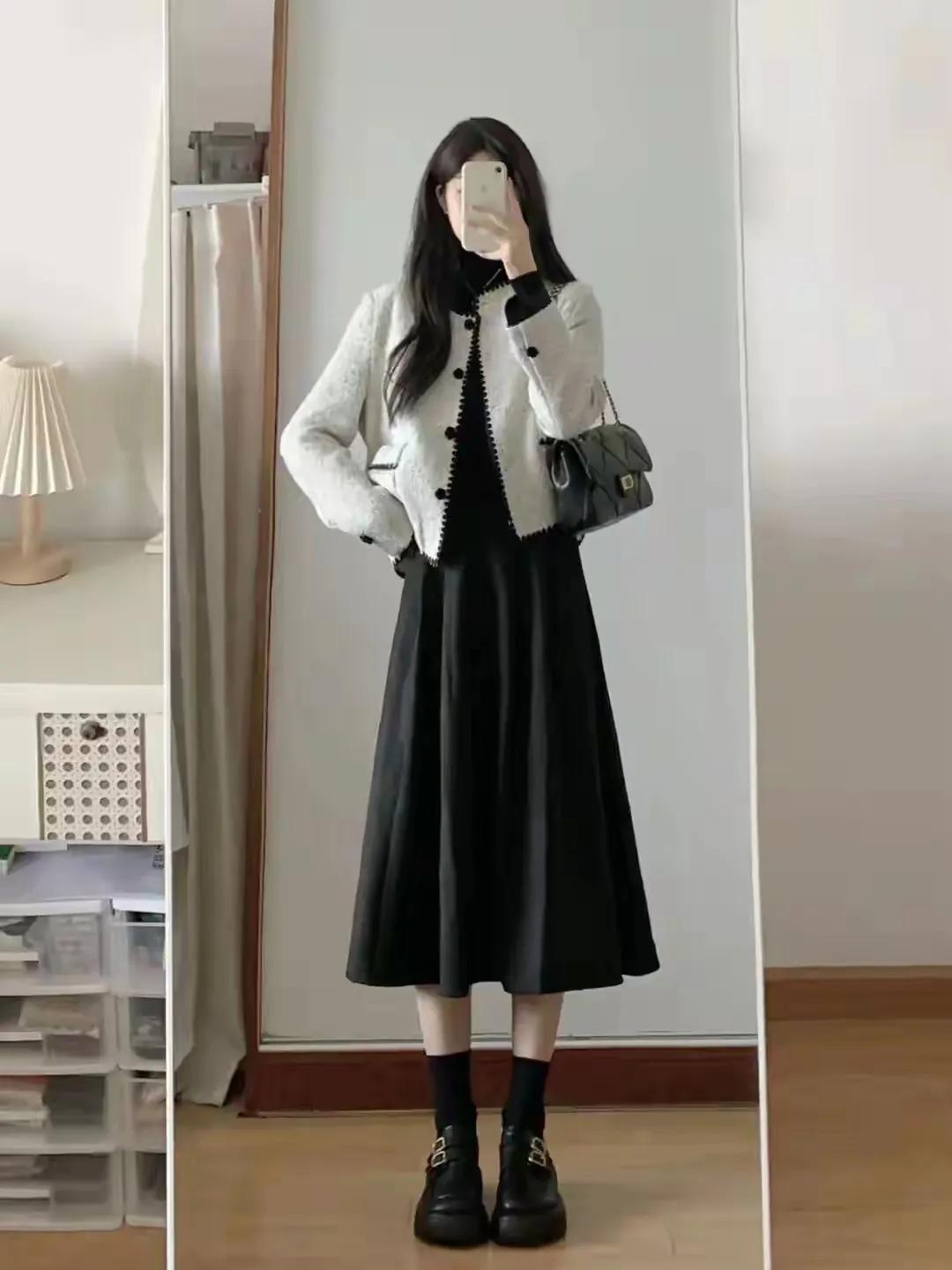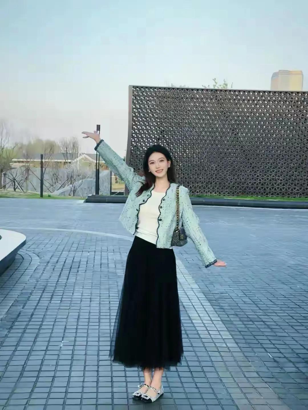 兩者搭配,小香風的精致感遇上黑半裙的穩重感,風格互補,既保留了各自的特色,又融合得恰到好處,適合多種場合,如職場、約會、日常出行等。