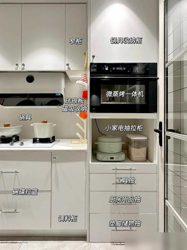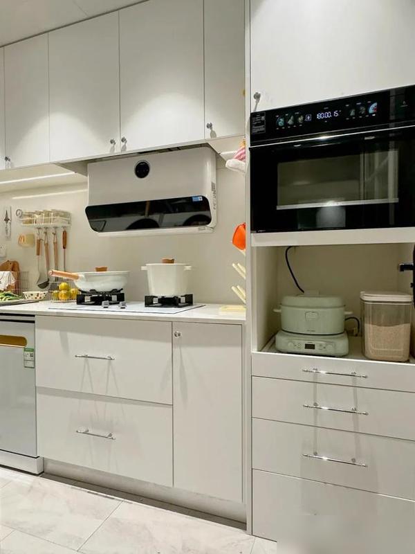 再說廚房,我媽以前總說“做飯像打仗”:臺面堆著電飯煲、咖啡機、空氣炸鍋,切個菜要挪三次東西,炒個菜油星子濺得電器上全是。后來她狠下心做了嵌入式廚電柜,把微蒸烤一體機嵌進高柜,臺面空出來放菜板和洗好的青菜;底部抽屜分了四層,一層放調料瓶(還做了傾斜設計,不用彎腰就能拿到),一層放鍋具,一層放碗碟,最下面一層放保鮮膜和廚房紙;連灶臺旁邊的墊腳處都做了個抽拉盒,放她的“秘密武器”——腌菜壇子。現在她做飯都要哼歌,說“臺面干凈,切菜都快兩分鐘”。