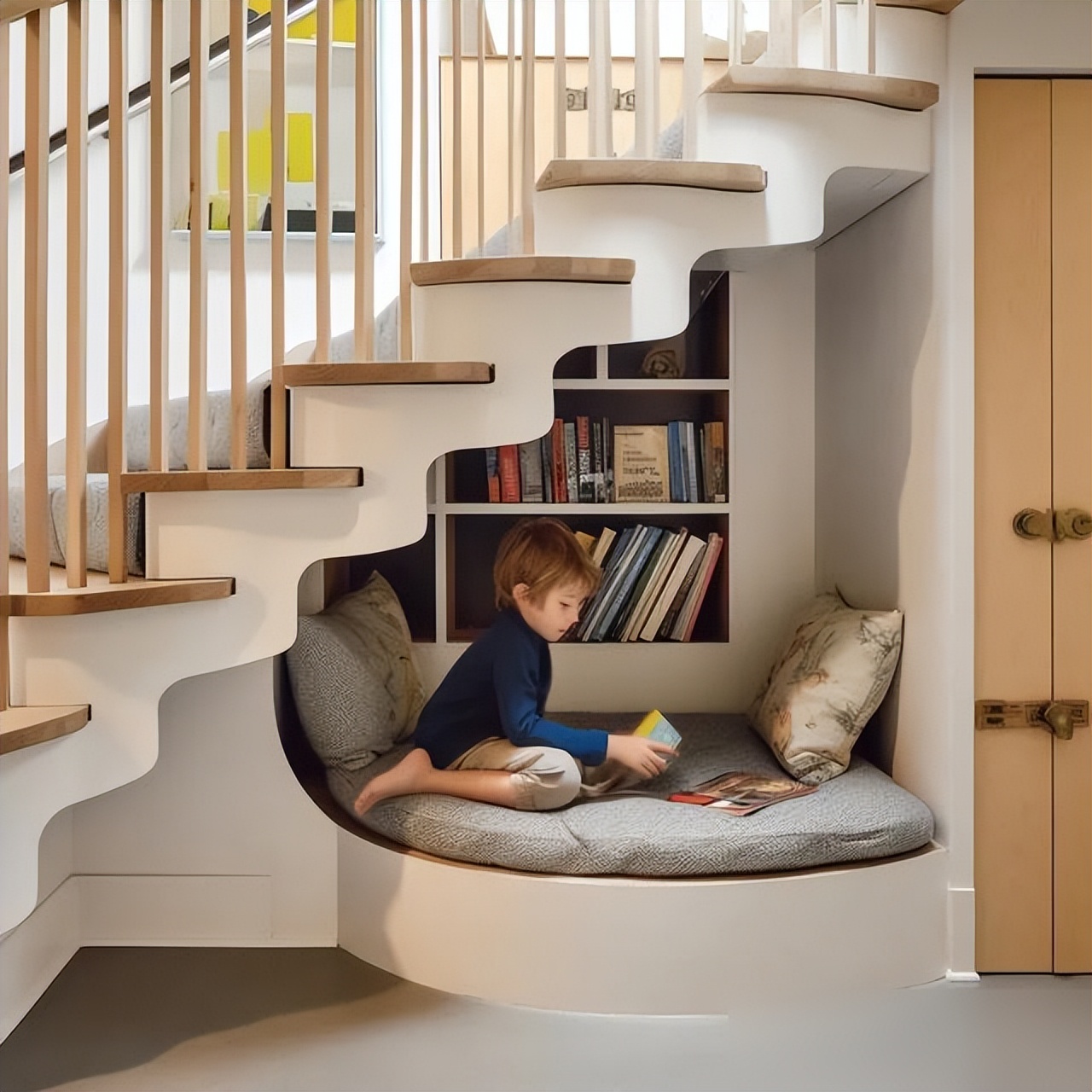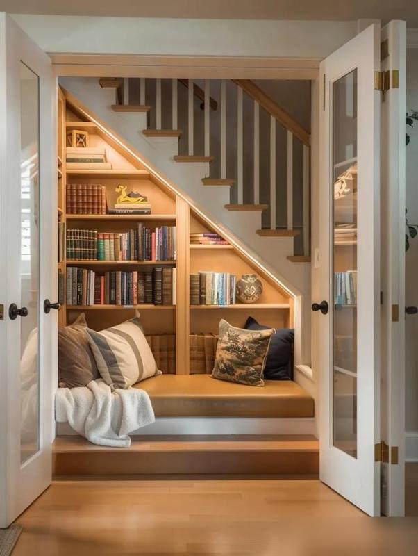 后來做了個貼合樓梯弧度的階梯矮柜,第一層放行李箱和露營裝備,第二層放孩子的玩具車,最下面一層加了個軟坐墊,直接變成換鞋凳——原來閑置的“垃圾角”,居然能變成“進家門先坐會兒”的溫柔角落,是不是比堆雜物聰明十倍?