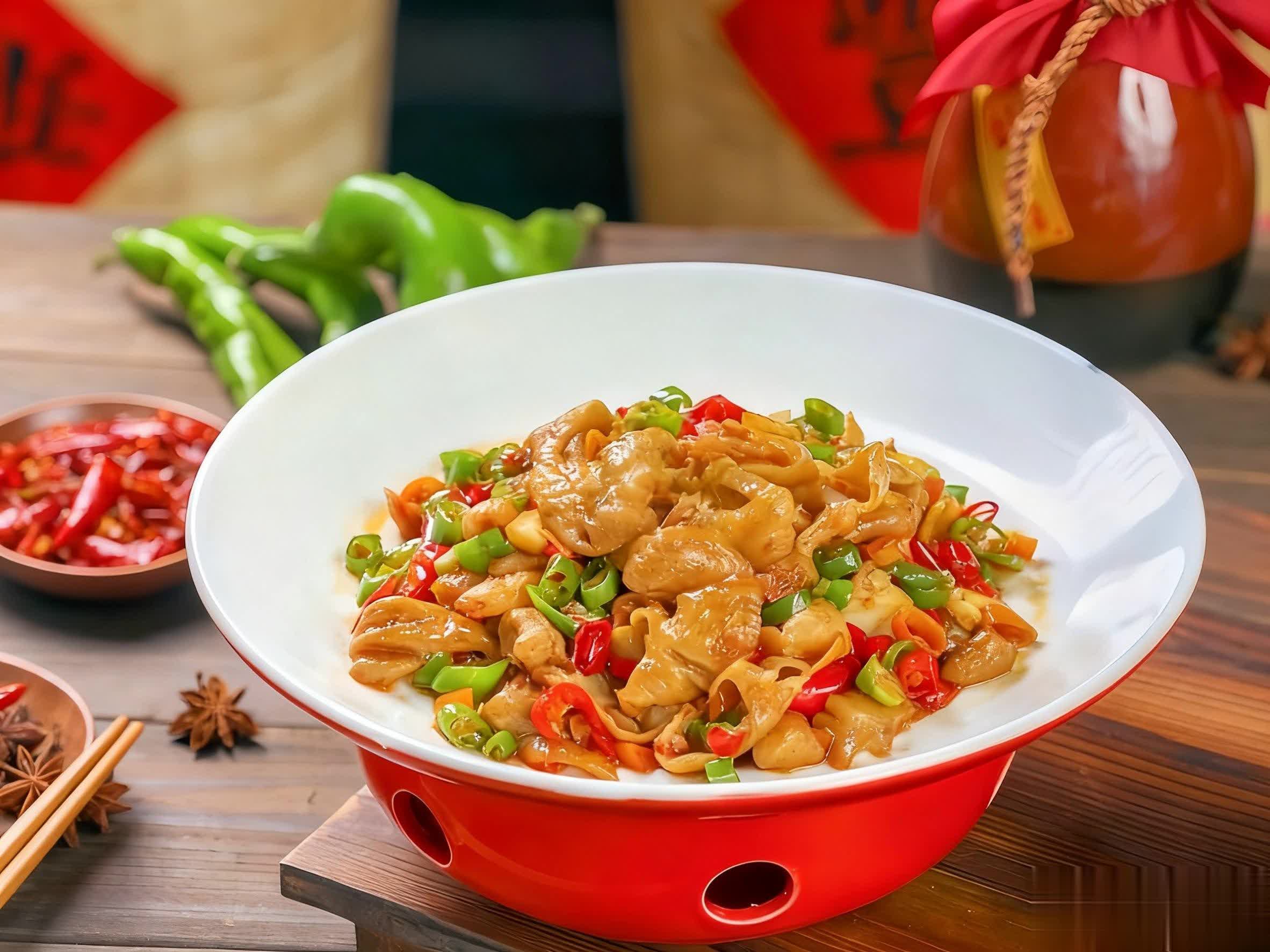 - 名稱溯源:“小炒鹵肥腸”,是經(jīng)典“香辣下飯菜”,以鹵肥腸的醇厚搭配青紅辣椒的鮮辣,紅白碗盛菜,木質(zhì)托盤墊底,背景八角與陶罐強(qiáng)化“市井煙火”感。