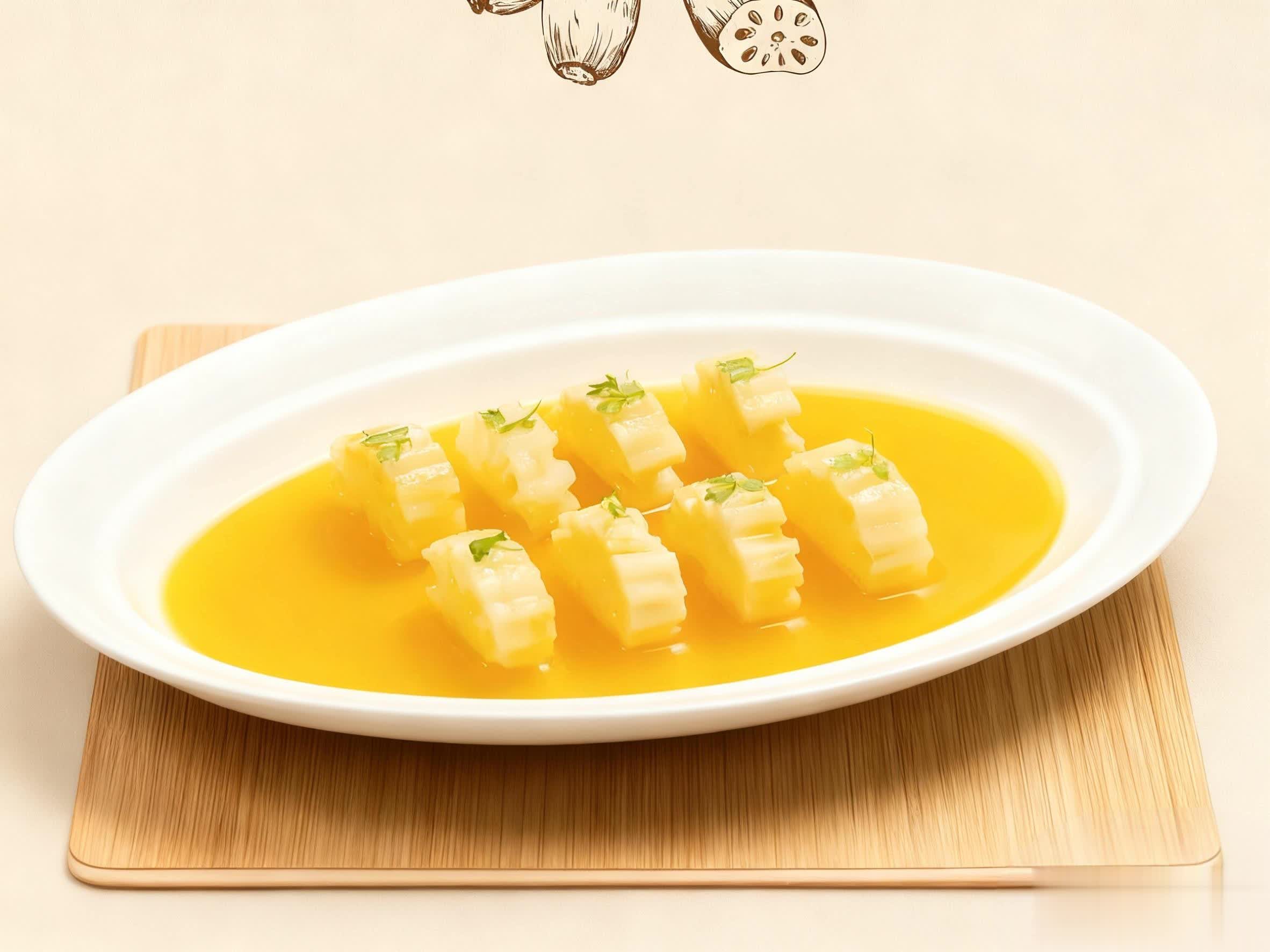- 名稱溯源:“百香果汁馬踏湖鮮藕”,以“湖鮮藕+百香果”組合,突出“初秋清爽”,白色橢圓盤盛菜,藕塊泡在金黃湯汁里,點(diǎn)綴香菜以豐富視覺效果。