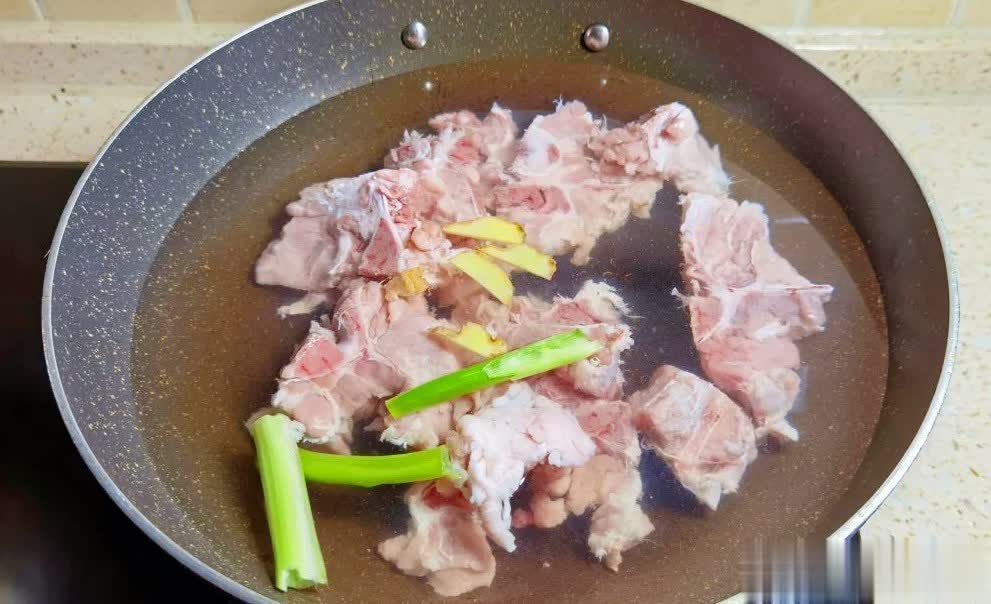 第一步:將排骨切成4厘米左右的小段,用清水浸泡20分鐘,泡出血水。這里有個小竅門:可以在水里加一勺鹽,這樣能更好地去除雜質。洗干凈的排骨冷水下鍋,加入姜片、1勺料酒,開中火慢慢加熱,千萬不要用熱水焯排骨,否則肉質會變柴,水開后繼續煮3分鐘,期間用勺子仔細撇去浮沫。
