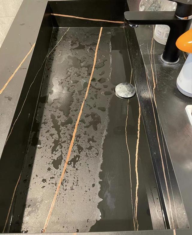 然而,在真正安裝并使用一段時間后,人們才深切體會到巖板一體盆的使用體驗實在難以用言語來形容。此臺盆深度較淺,在使用過程中極易濺出水花,且排水速度遲緩,臺盆內(nèi)時常殘留積水。這是由于巖板本身硬度較高,無法像陶瓷臺盆那樣,設(shè)計出帶有曲面弧度的坡面,從而能夠?qū)⑺杆賹?dǎo)流至排水口。